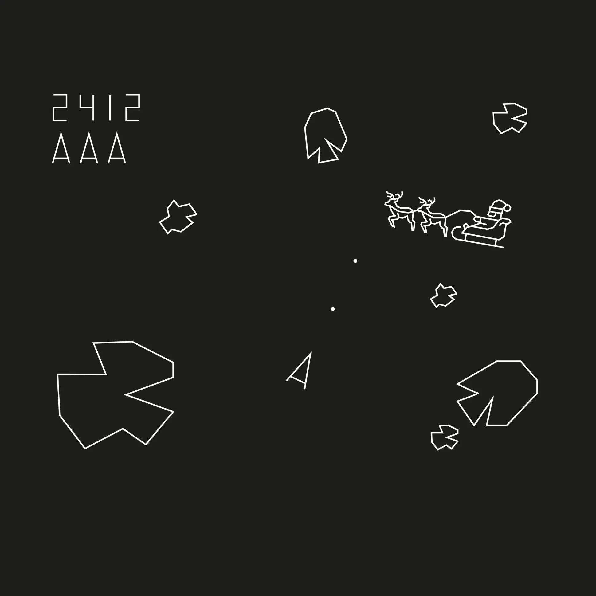 - Aufkleber mit einem weihnachtlichen Motiv, das an das Spiel Asteroids erinnert