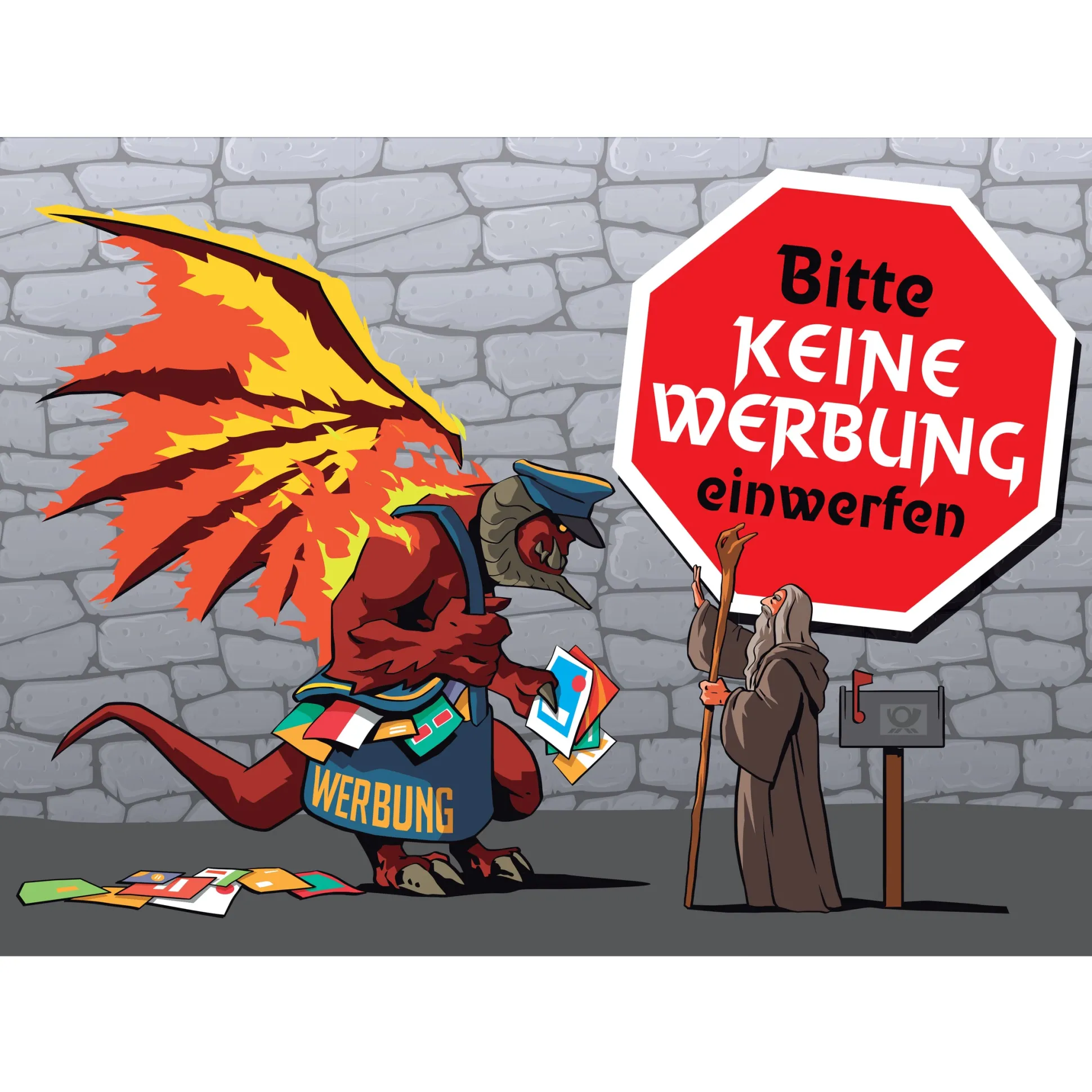Vielleicht wirkt der ganz und gar nicht dezente Aufkleber „Keine Werbung einwerfen“ ein bisschen besser: Auf diesem Aufkleber siehst Du einen Post-Balrog (ja, die gibt es!), der seine Prospekte einfach so in den Briefkasten eines grauen Zauberers einwerfen will – aber da hat er die Rechnung ohne den Mithrandir gemacht: Dieser ruft ihm „BITTE KEINE WERBUNG EINWERFEN!“ entgegen. Und mit Balrogs kennt er sich ja bekanntlich bestens aus.
