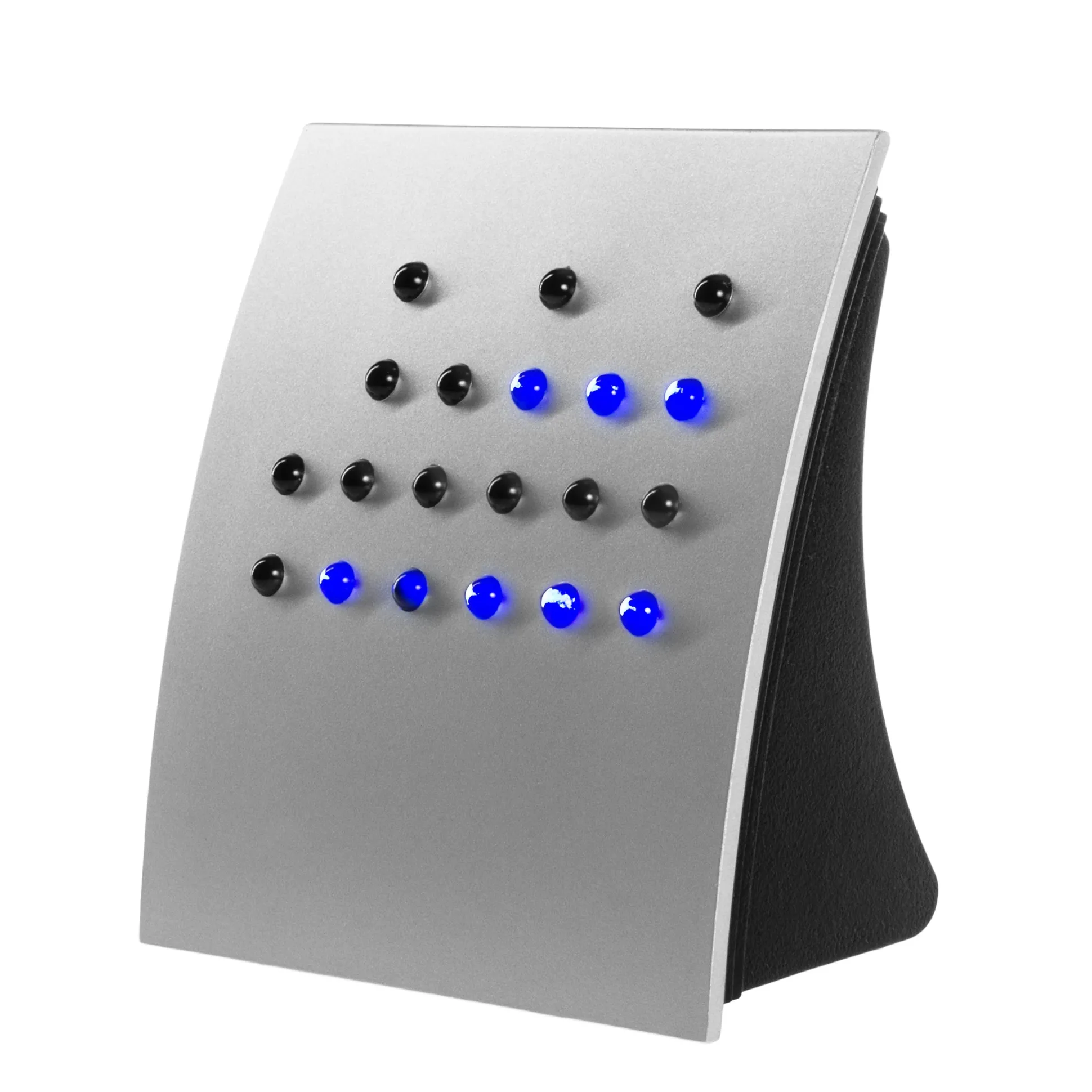 Zusätzlich kannst Du bei dieser neuen Edition der Binäruhr auch auf einen „echten“ Binärbetrieb umstellen, wobei dann die unteren drei Zeilen für Sekunden, Minuten und Stunden stehen. (Auf dem Bild ist die Uhrzeit in diesem Modus z.B. 5:11:34)