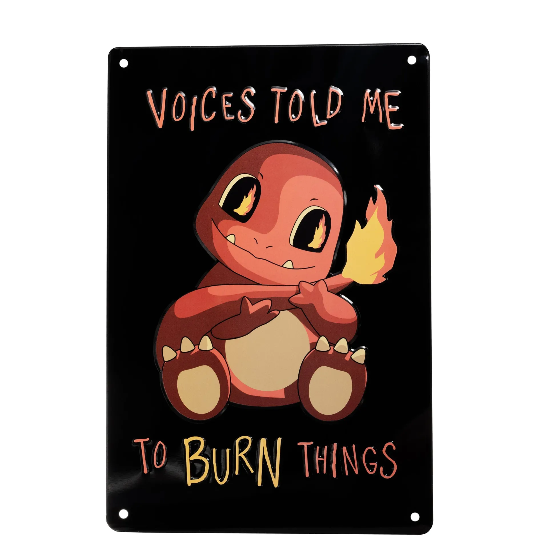Mit Blick auf das Blechschild Voices Told me to Burn Things erscheint diese unheimliche Annahme leider durchaus plausibel. Denn die kleine Echse, die mit leicht irrem Grinsen ihre lodernde Schwanzspitze liebkost, sagt eindeutig: „Voices told me to burn things.“ (In etwa: Die Stimmen haben mir gesagt, dass ich Dinge verbrennen soll.) Na gut: Manche kämpfen für Ehre, manche für Ruhm – und manche sind einfach nur ein bisschen [i]speziell[/i]. 😉 Das Blechschild zu Ehren des durchgeknallten Monsters kannst du übrigens ganz einfach mit Schrauben, Nägeln oder doppelseitigem Klebeband (nicht enthalten) an der Wand befestigen.