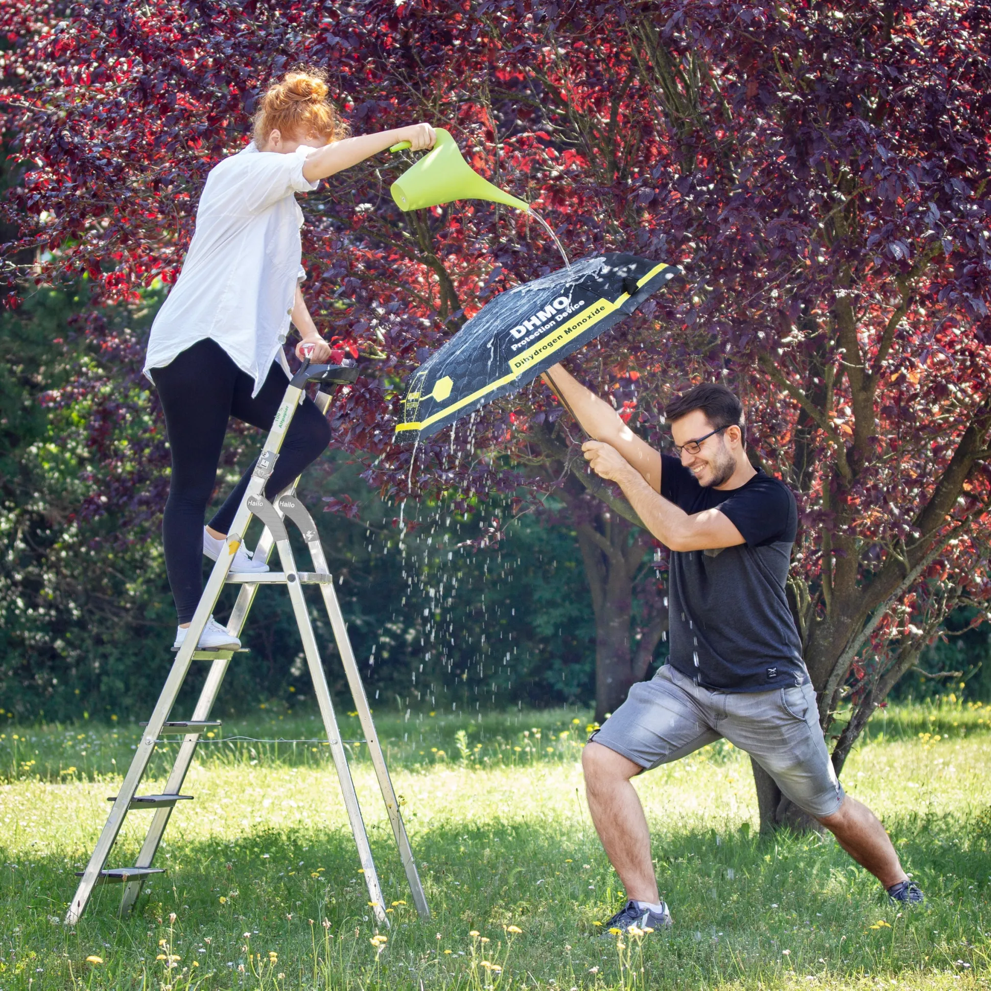 Doch Du kannst Dich schützen! Der DHMO-Regenschirm ist im wahrsten Sinne des Wortes ein Abwehrschirm, der Dich und andere vor direkter DHMO-Einwirkung beschützt! Auf Knopfdruck entfaltet sich der schützende Schirm und sorgt dafür, dass Dich die fiesen DHMO-Tropfen nicht erwischen! Aber pass auf, dass Du auch wirklich unter dem Schirm bleibst – längerer DHMO-Kontakt kann zu irreparablen Schäden und sogar zum Tod führen!