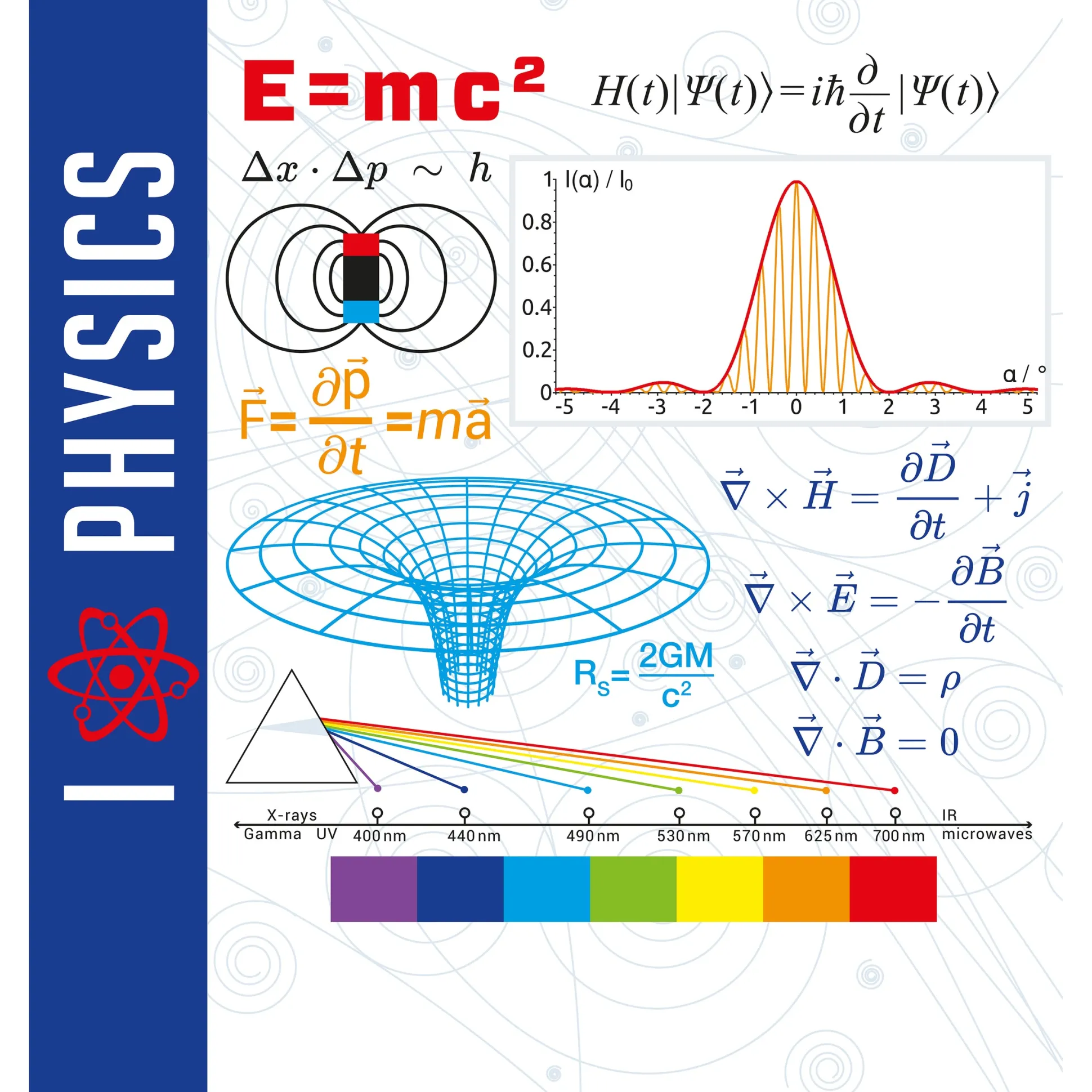 - Zeigt bekannte Elemente der Physik wie die Relativitätsformel, den Schwarzschild-Radius und das Lichtspektrum