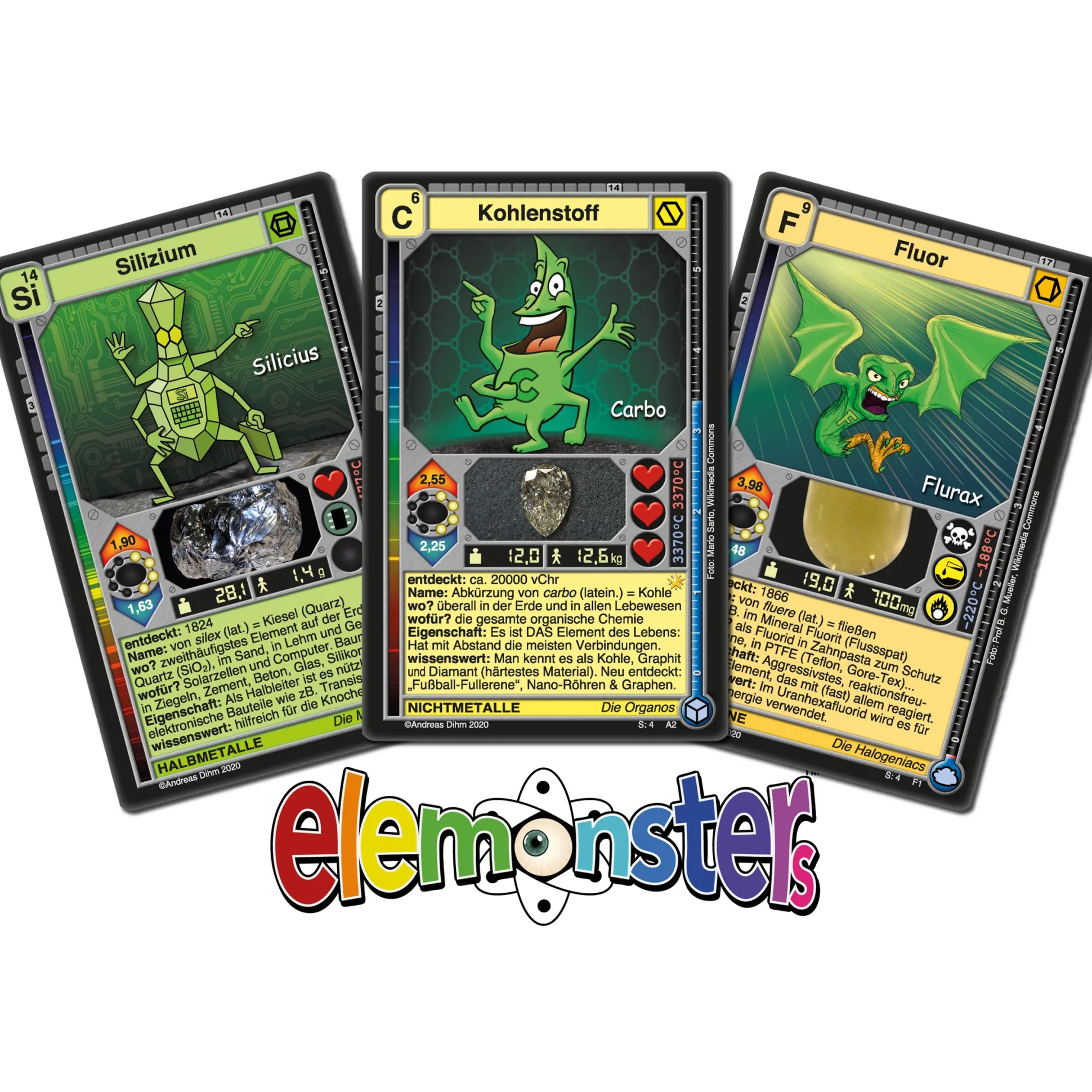 Das von der Gesellschaft Deutscher Chemiker präsentierte Elemonsters – Chemie-Kartenspiel mit Smartphone-App stellt chemische Elemente als bunte kleine Monster vor, die zusammen Allianzen bilden oder gegeneinander kämpfen. Das Hauptziel des Spiels ist es, chemische Verbindungen aus verschiedenen Elementen zu erzeugen und abzulegen. Dabei werden die Elemonsters anhand ihrer Eigenschaften gegeneinander ausgespielt. Jede Karte enthält eine Illustration und eine Menge hilfreicher Informationen.