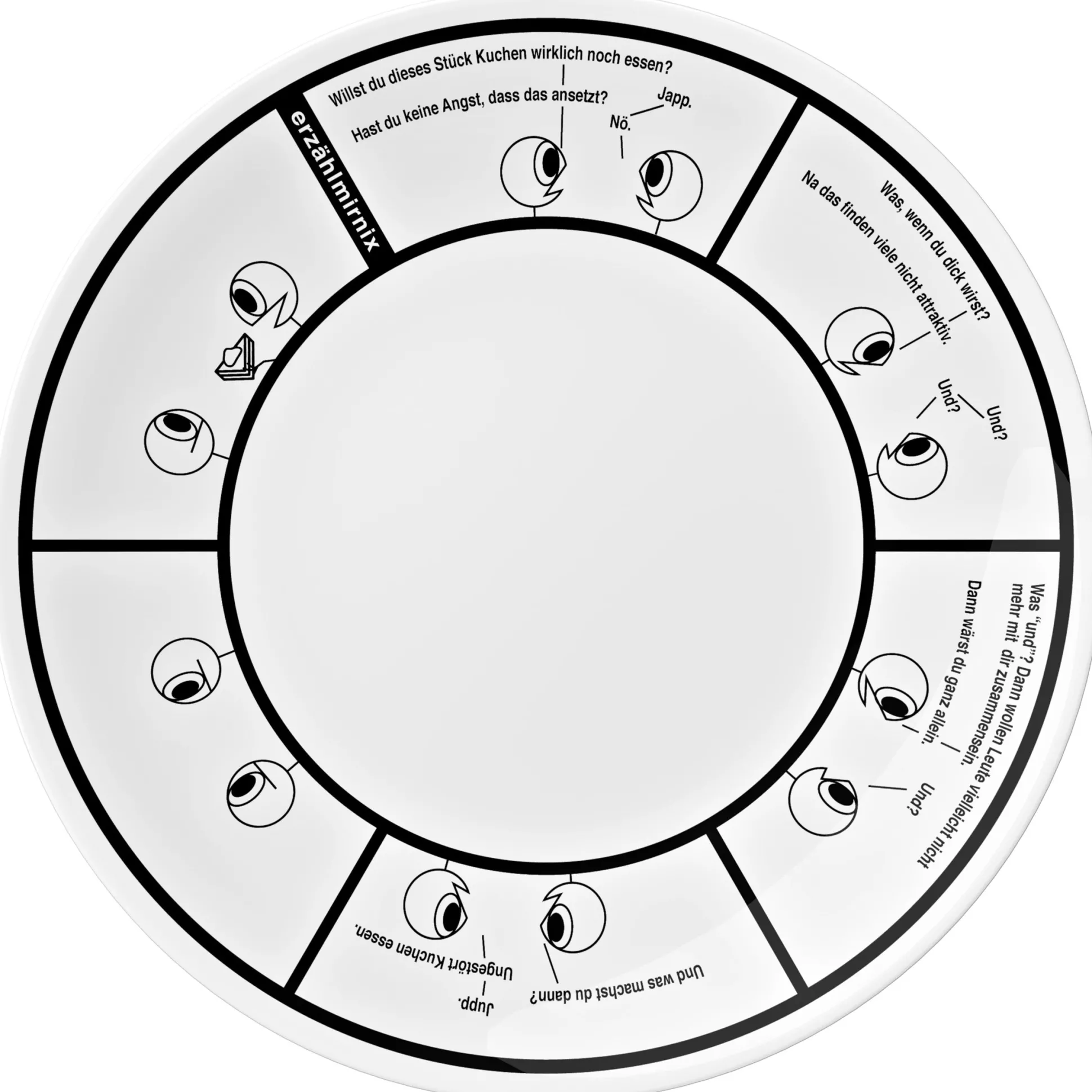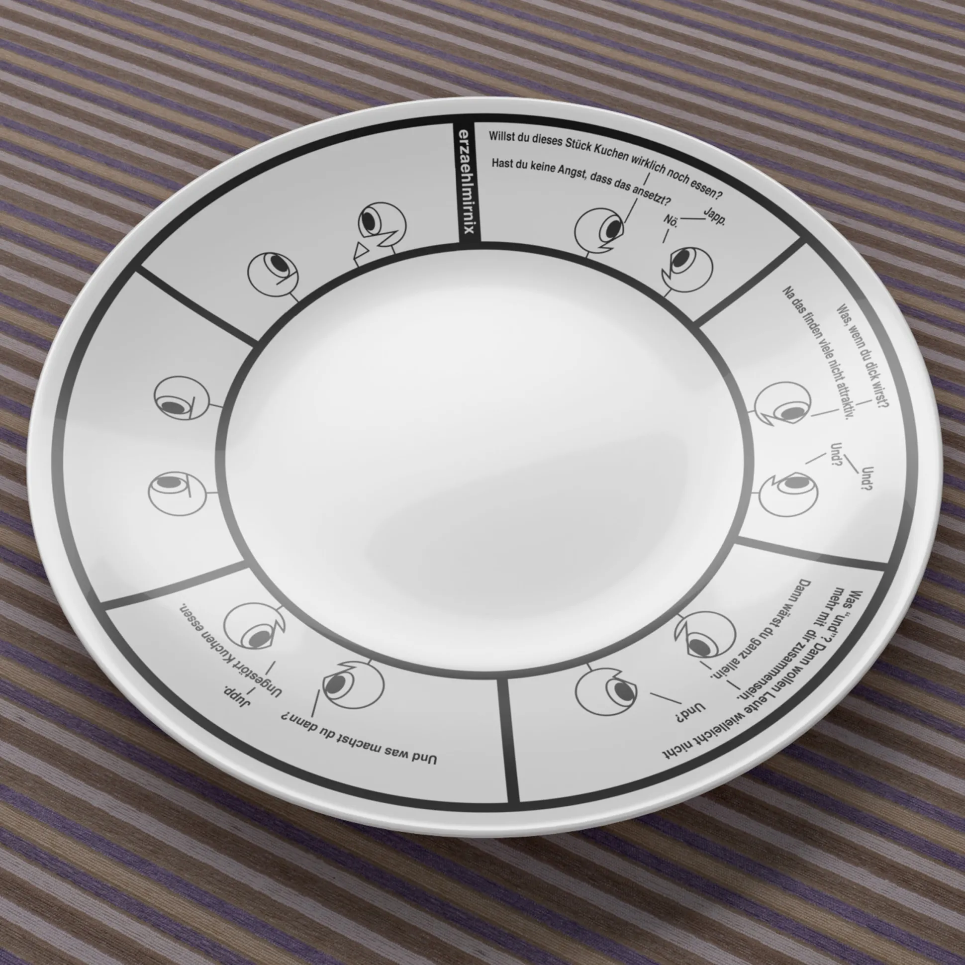- Kuchenteller aus Porzellan, der mit einem Erzaehlmirnix-Webcomic verziert ist
