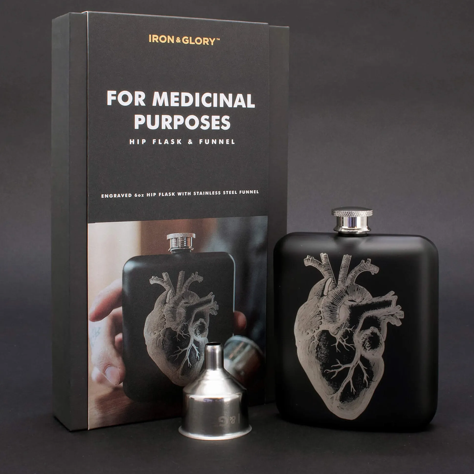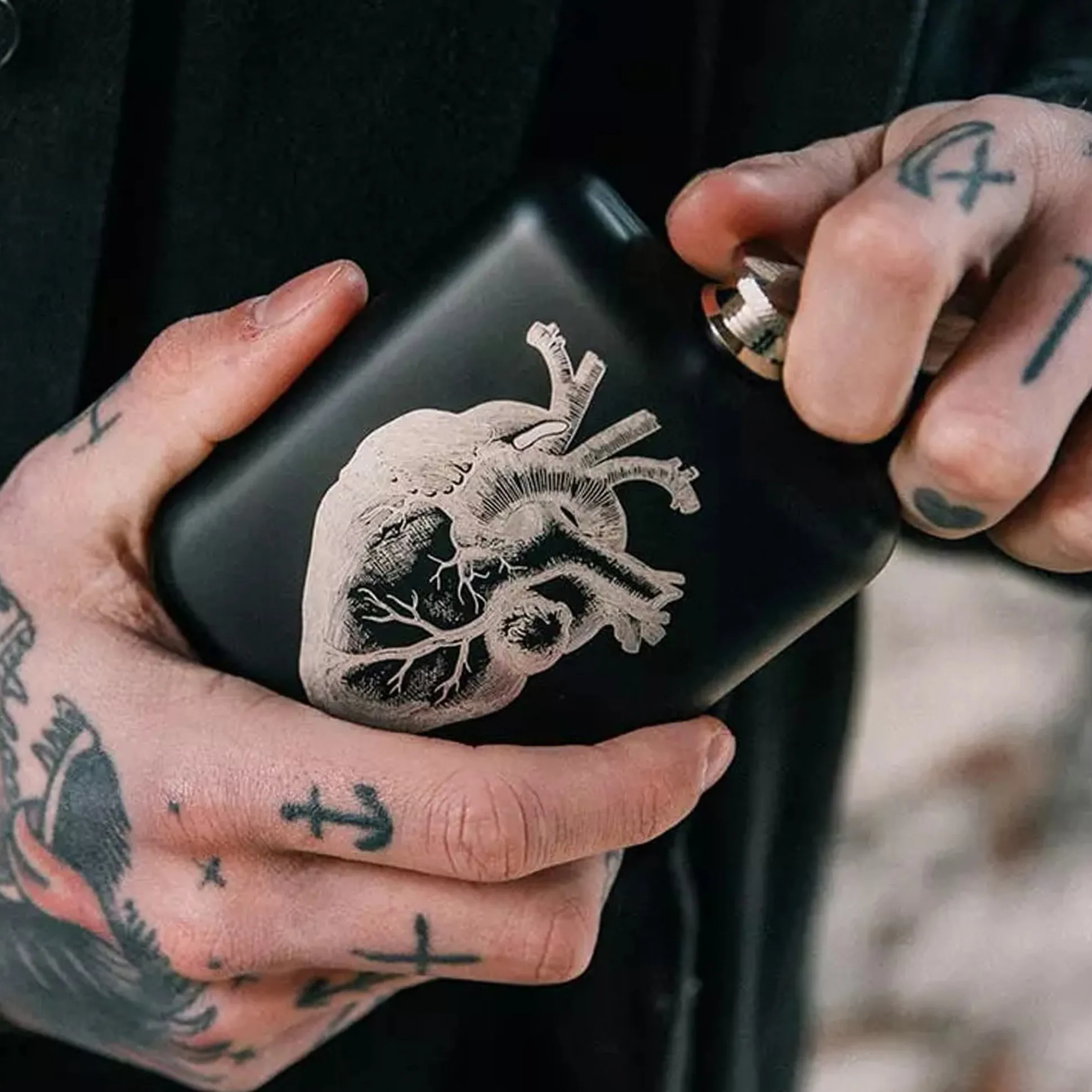 Der schwarze Stahl-Flachmann eignet sich perfekt für den Transport eines guten Tropfens und kann mit einem Drehverschluss verschlossen werden. Die Front ist mit einer Lasergravur verziert, die ein hochdetailliertes anatomisches Herz zeigt.