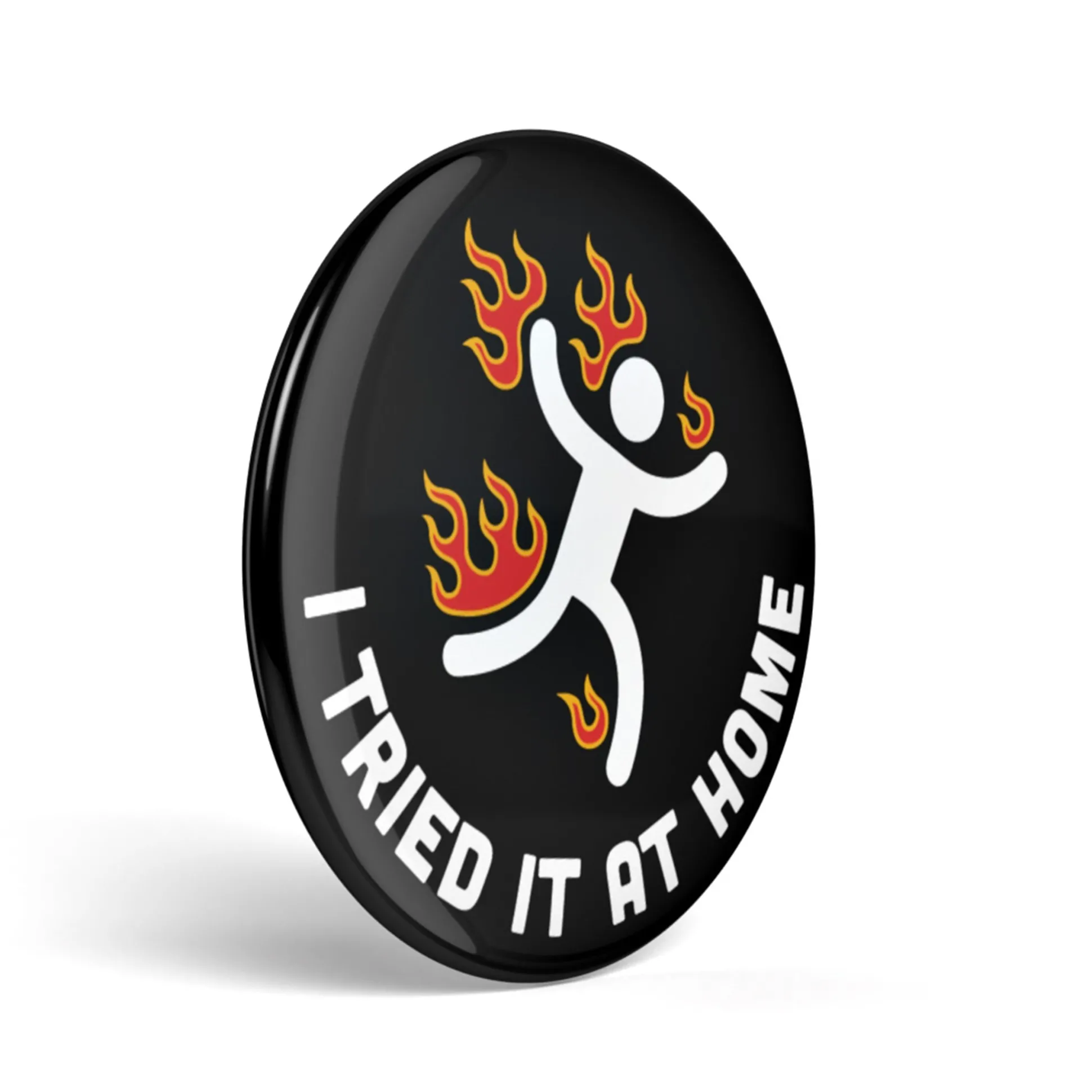 Und die Sache mit dem Nachmachen… nun ja, sieh selbst: Der Geek Button „I tried it at home“ zeigt dir recht drastisch, was passieren kann, wenn du Experimente aus dem Fernsehen oder dem Internet nachmachst – du könntest spontan Feuer fangen und anschließend schreiend durch die Gegend rennen. Aber mal ganz im Ernst: Bitte pass auf, dass du dich beim heimischen Experimentieren nicht verletzt. 5 Minuten Internet-Fame sind es nicht wert, Leib und Leben aufs Spiel zu setzen. 🙂