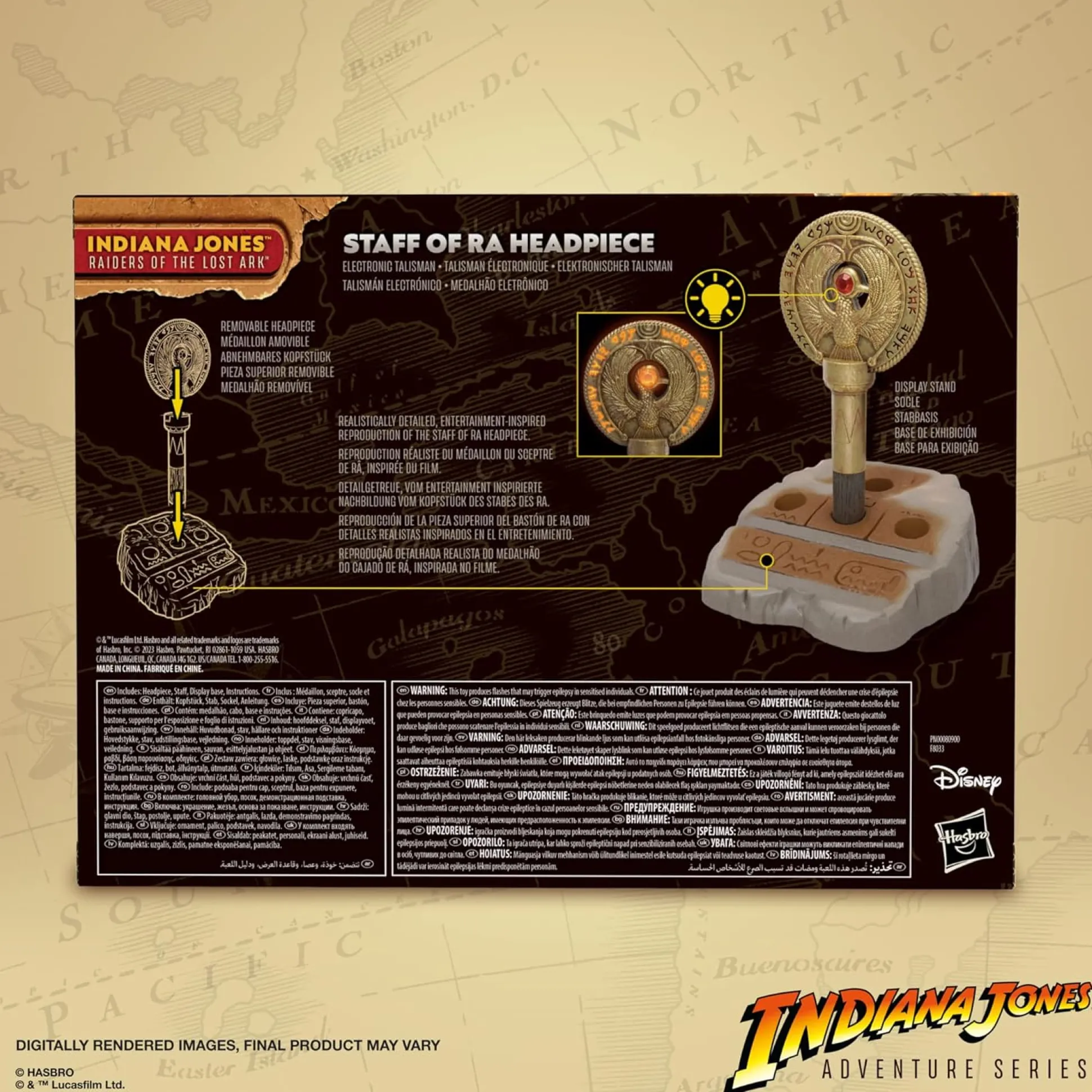 Der detailgetreue elektronische Talisman kommt mit beleuchteten Inschriften, einem zentralen Lichtkristall sowie einem hochwertigen Präsentationsständer, der dem Boden der Sonnentempel-Szene nachempfunden ist. Das Kopfstück selbst ist abnehmbar, besitzt eine metallische Optik und Haptik und wurde dem legendären Medaillon nachempfunden, mit dem Indy die geheime Lage der Bundeslade in der Karte von Tanis offenlegt. Lichtaktivierte Effekte bringen das Replikat wortwörtlich zum Strahlen – perfekt für dunkle Grabkammern oder Wohnzimmer mit Dämmerlicht. Zur Stromversorgung verwendet das Replikat 2xAA Batterien (Nicht enthalten).