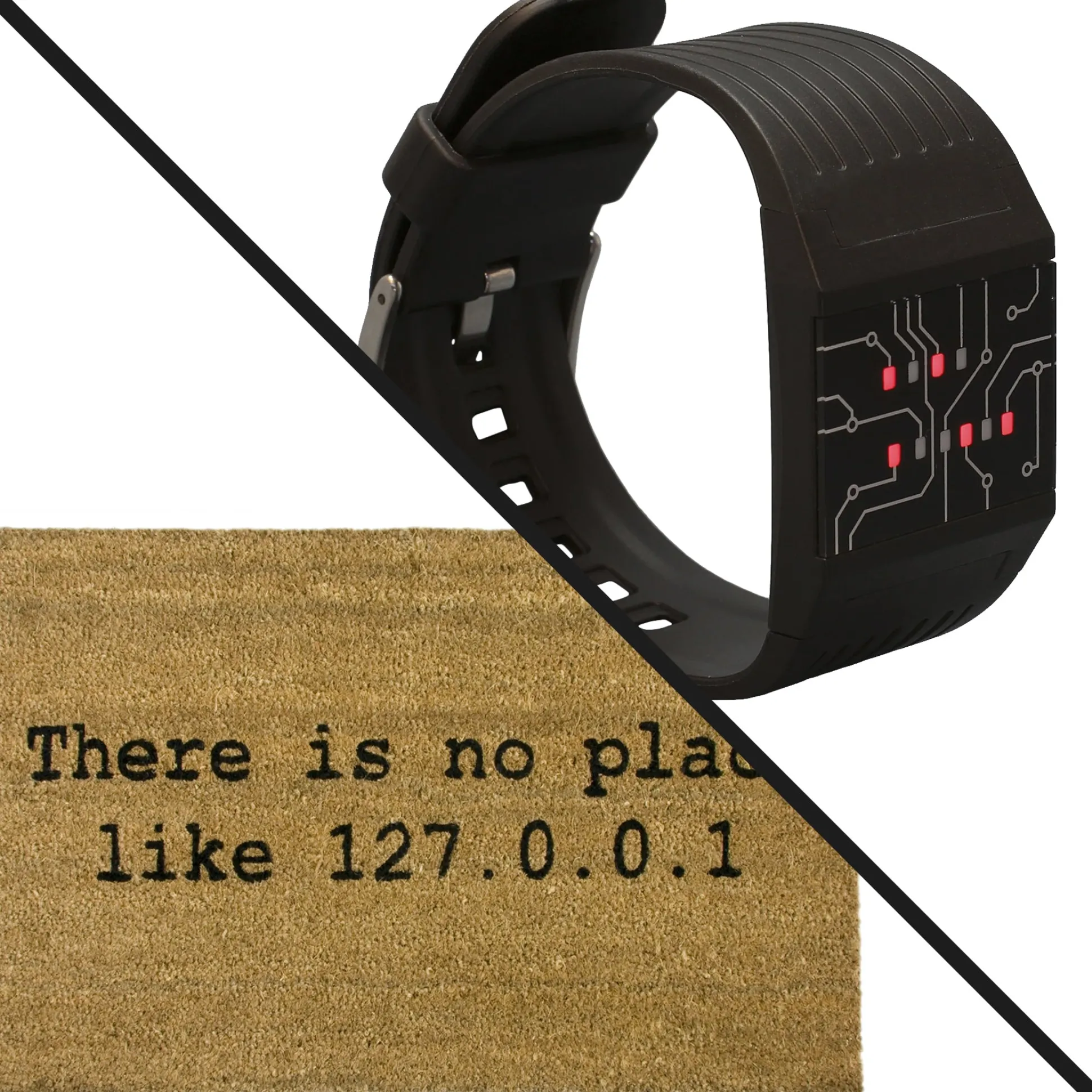 Eine witzige Hommage an die Informatik: Diese Fußmatte mit der Adresse des „localhost“ zeigt, wo dein Zuhause ist – ideal für Nerds, die auf subtile Technikreferenzen stehen. - Binäre Armbanduhr