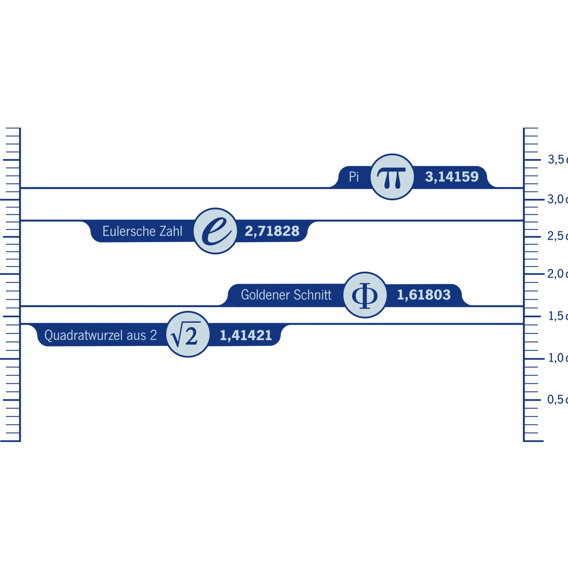 Denn das Irrationale Zahlen Trinkglas ist mit einer Skala in Deziliter versehen, und würdigt gleichzeitig vier irrationale Zahlen aus der Mathematik. Zum Beispiel kannst du demnächst bei ca. 1,41421 (Eulersche Zahl) dl Whiskey oder ca. 3,14159 (Pi) dl Limonade die Errungenschaften der Mathematik feiern. Die Angaben auf dem Glas umfassen für jede irrationale Zahl das Symbol, den Namen, und die Dezimalschreibweise bis auf 5 Nachkommastellen.
