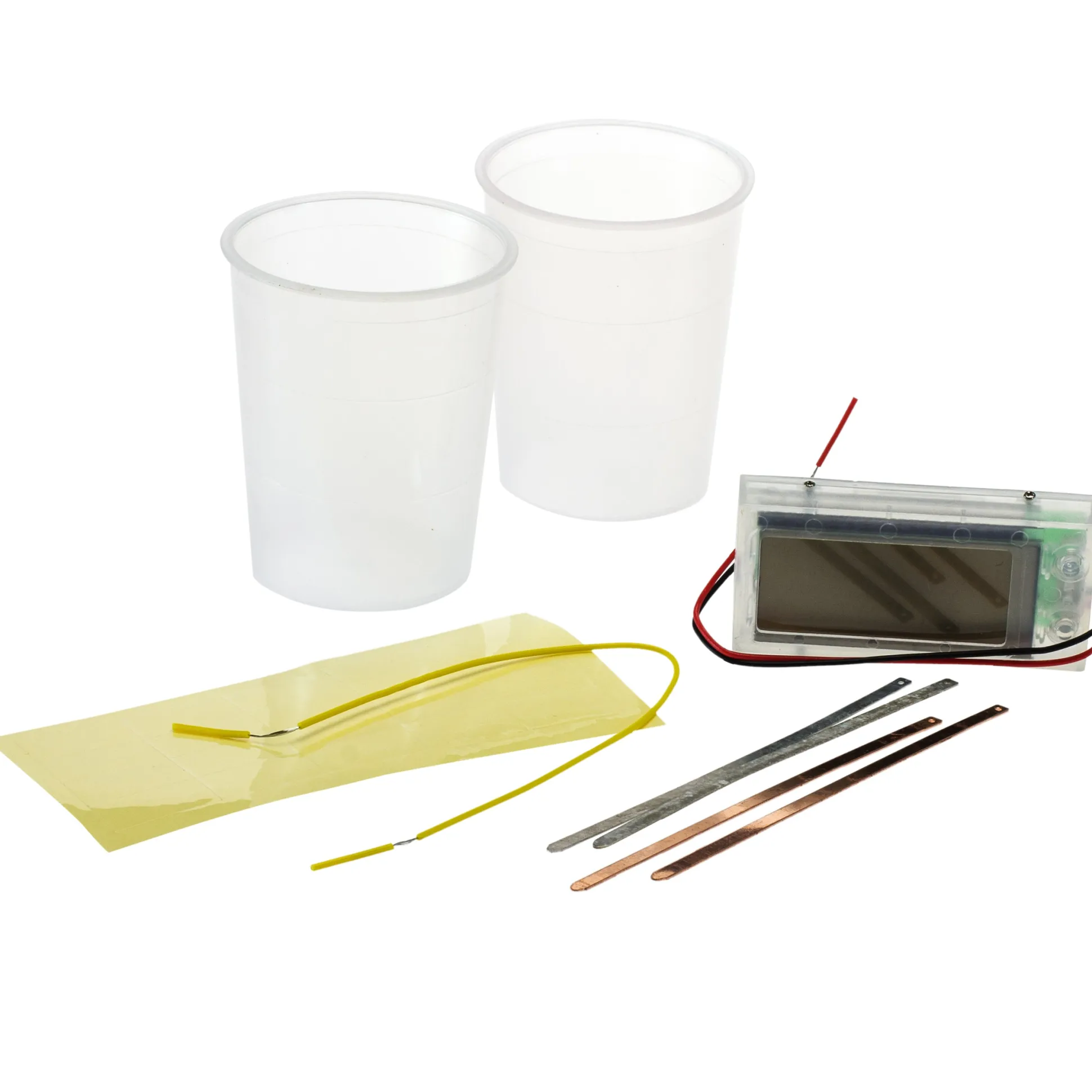 Neben der Digitaluhr selbst, Kabeln, Kupfer- und Zinkstreifen enthält das Set auch zwei Becher, mit deren Hilfe man z.B. aus Salzwasser oder Zitronensaft eine Batterie herstellen kann.