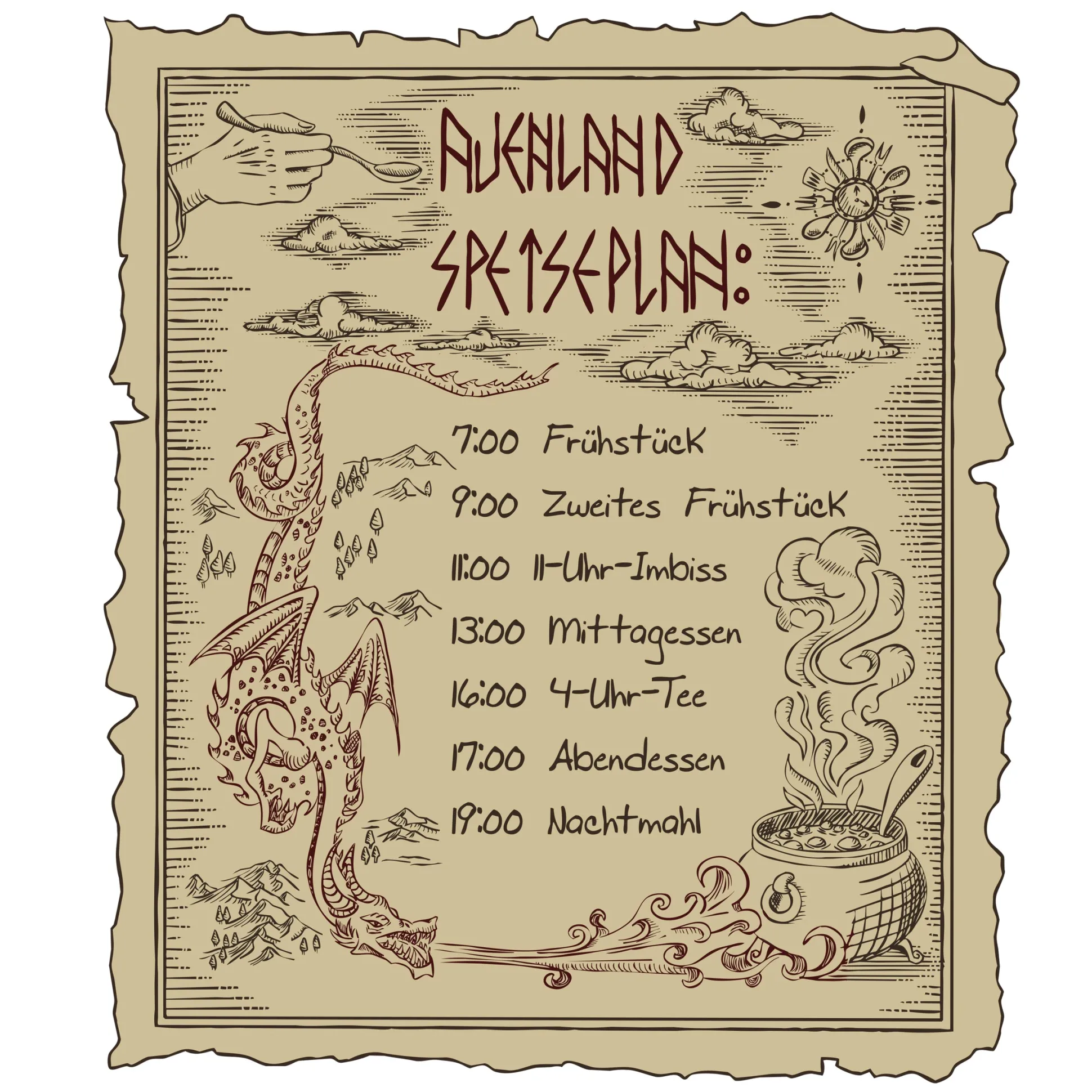 - In Anlehnung an den vollen Speiseplan der gefräßigen Auenland-Bewohner werden alle wichtigen Mahlzeiten des Tages aufgelistet