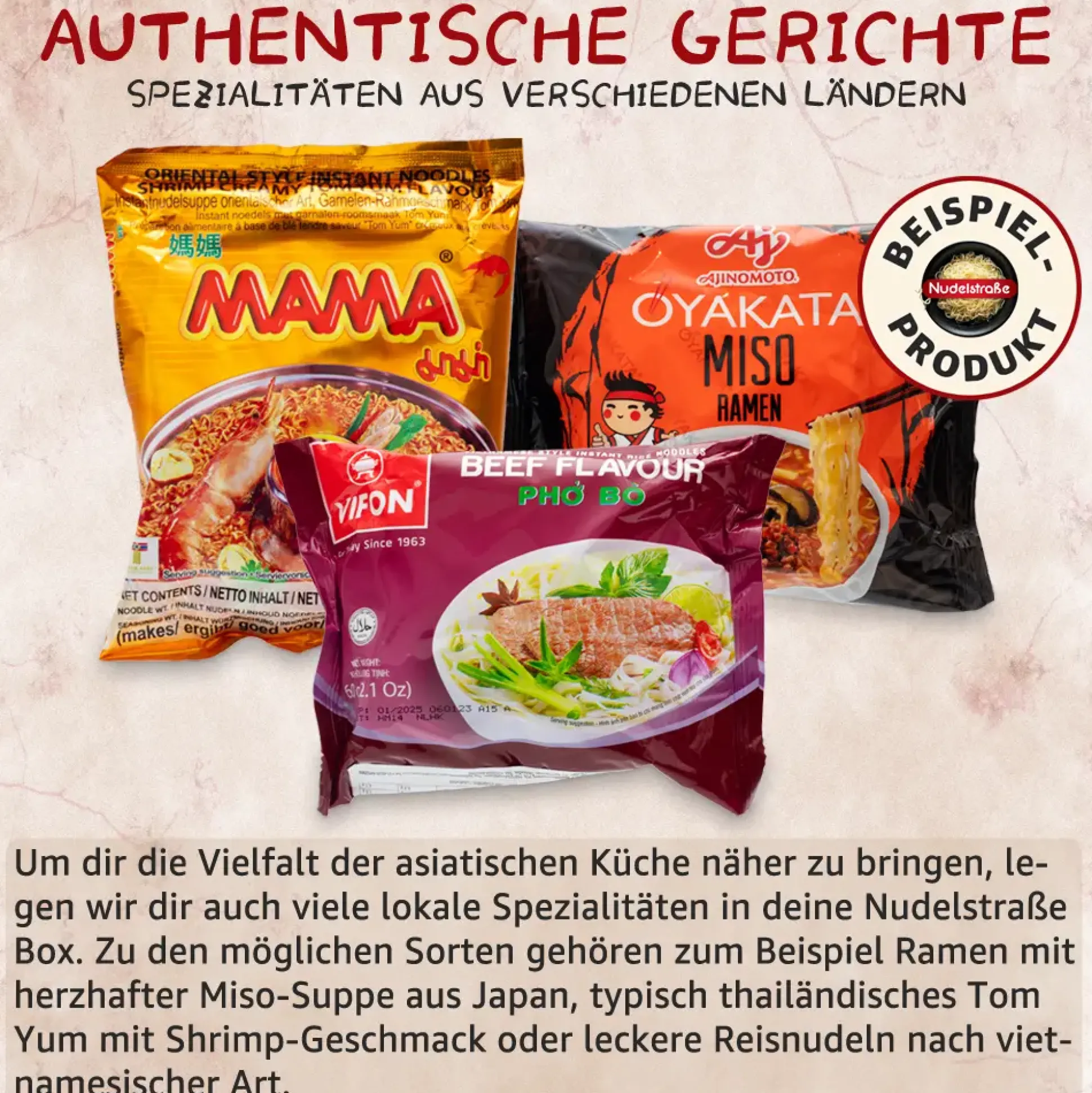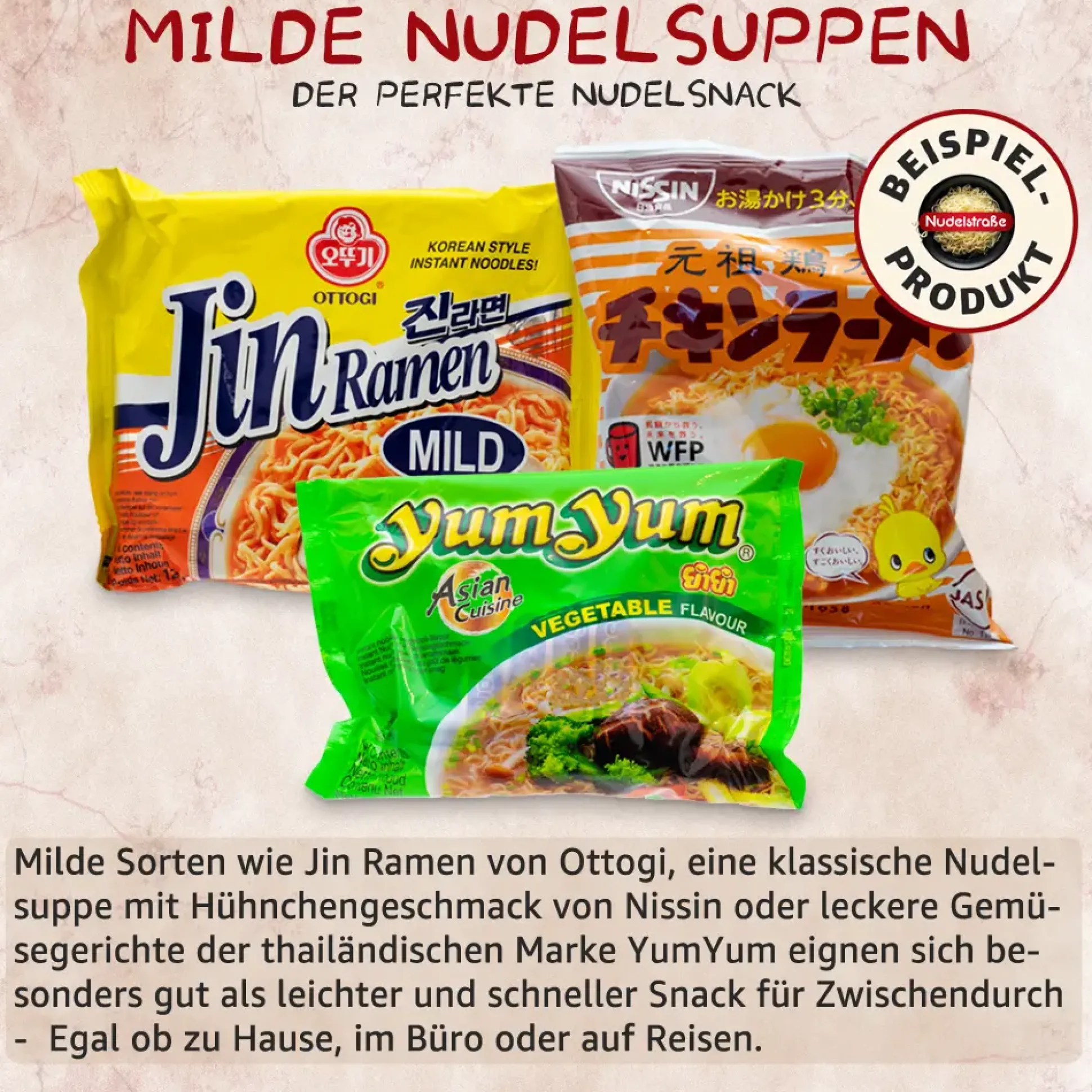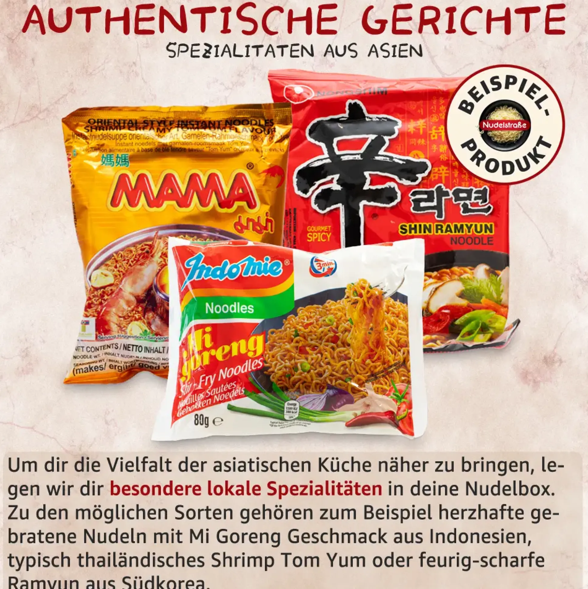 - Enthaltene Geschmacksrichtungen können u.a. Mie Goreng, Sesam, Tom Yum oder Hühnchen sein