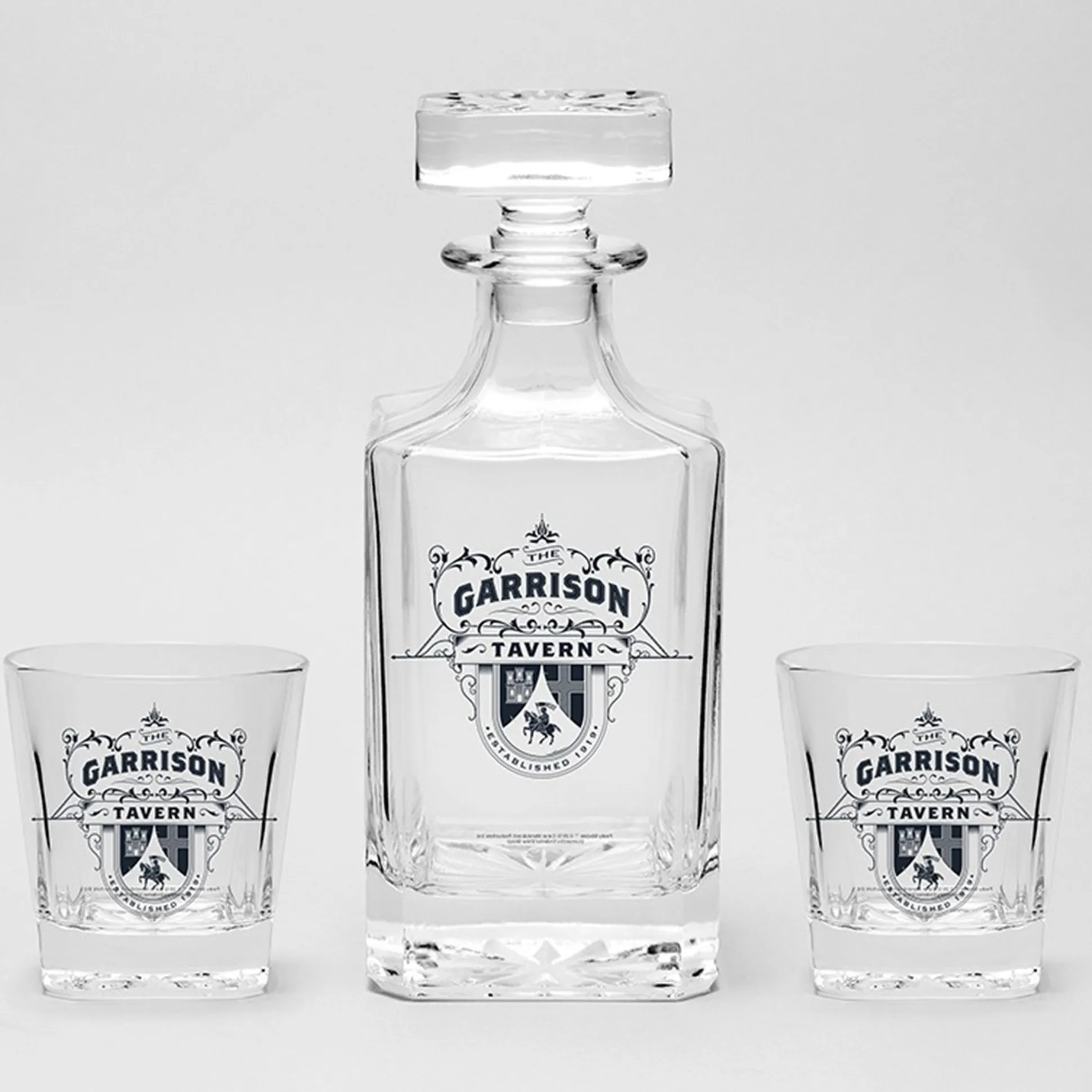 - Set aus einer Glaskaraffe und 2 Gläsern mit dem Logo des Garrison Pubs aus der Serie „Peaky Blinders“