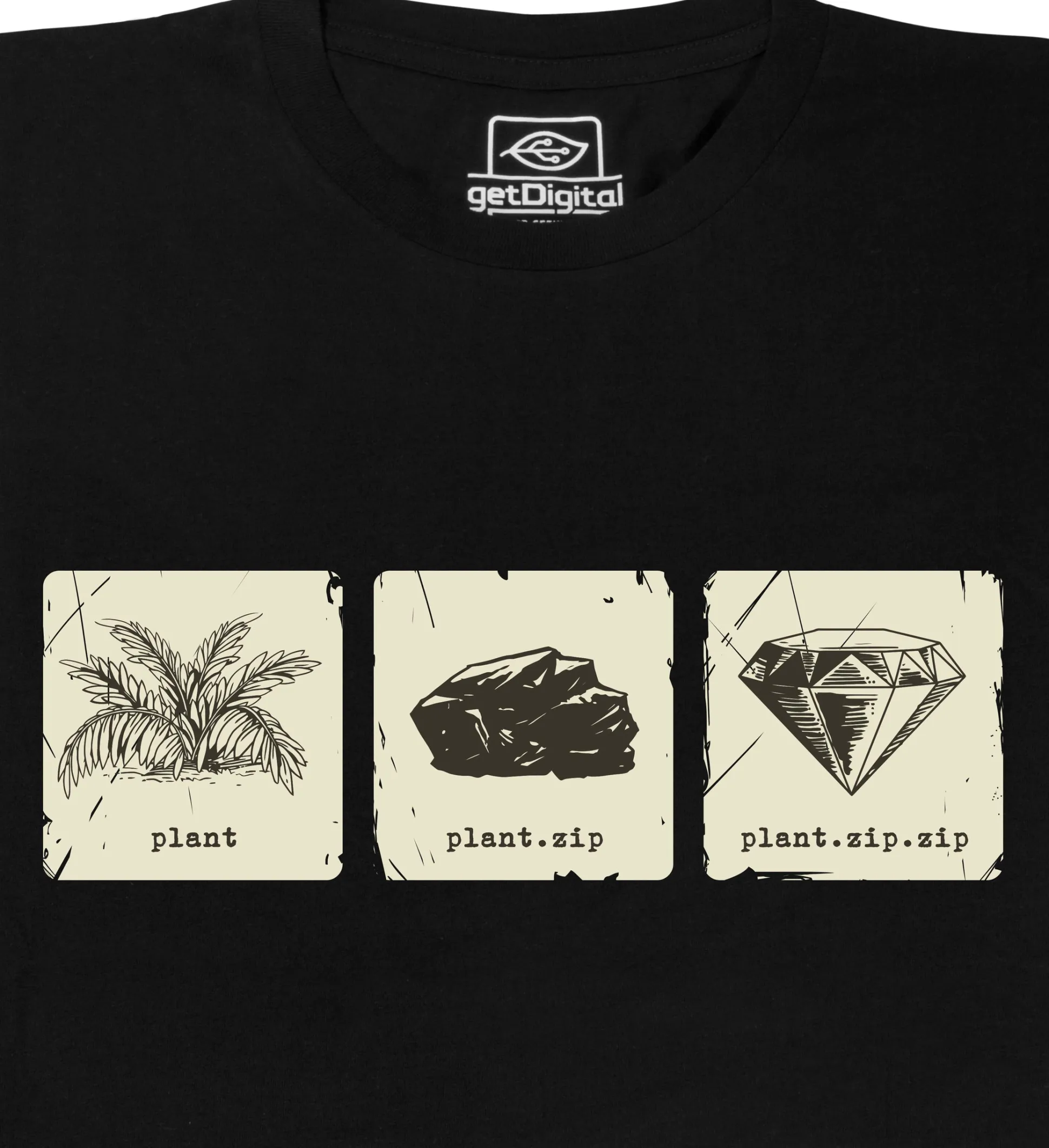 Denn wie das „Plant.zip.zip“-T-Shirt uns in Erinnerung ruft, verwandeln sich (stark vereinfacht ausgedrückt) komprimierte Pflanzen in Kohle und komprimierte Kohle in Diamanten! In Anlehnung an das weit verbreitete .zip-Format für komprimierte Dateien lassen sich Kohle und Diamanten folglich auch als plant.zip bzw. plant.zip.zip bezeichnen. Um reich zu werden, benötigst Du also nur genug Pflanzen, jede Menge Druck und ein bisschen Geduld.