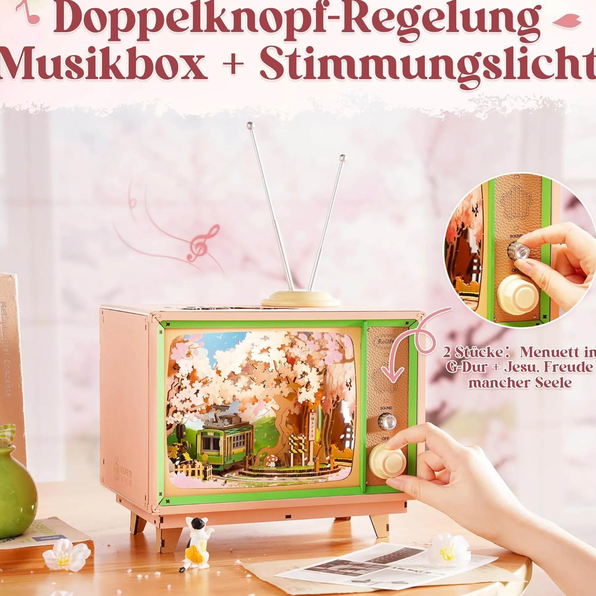 Tauche ein in eine zauberhafte Miniaturwelt der Kirschblütenzeit! Der Sakura Traumtour Retro TV Spieluhr Holzbausatz bringt nostalgischen Charme und moderne Technik in einem liebevoll gestalteten DIY-Projekt zusammen. Inspiriert vom Retro-Fernseher-Design entfaltet sich im Inneren eine dynamische Szenerie mit einer fahrenden Straßenbahn unter blühenden Kirschbäumen – begleitet von Musik, Licht und Bewegung.