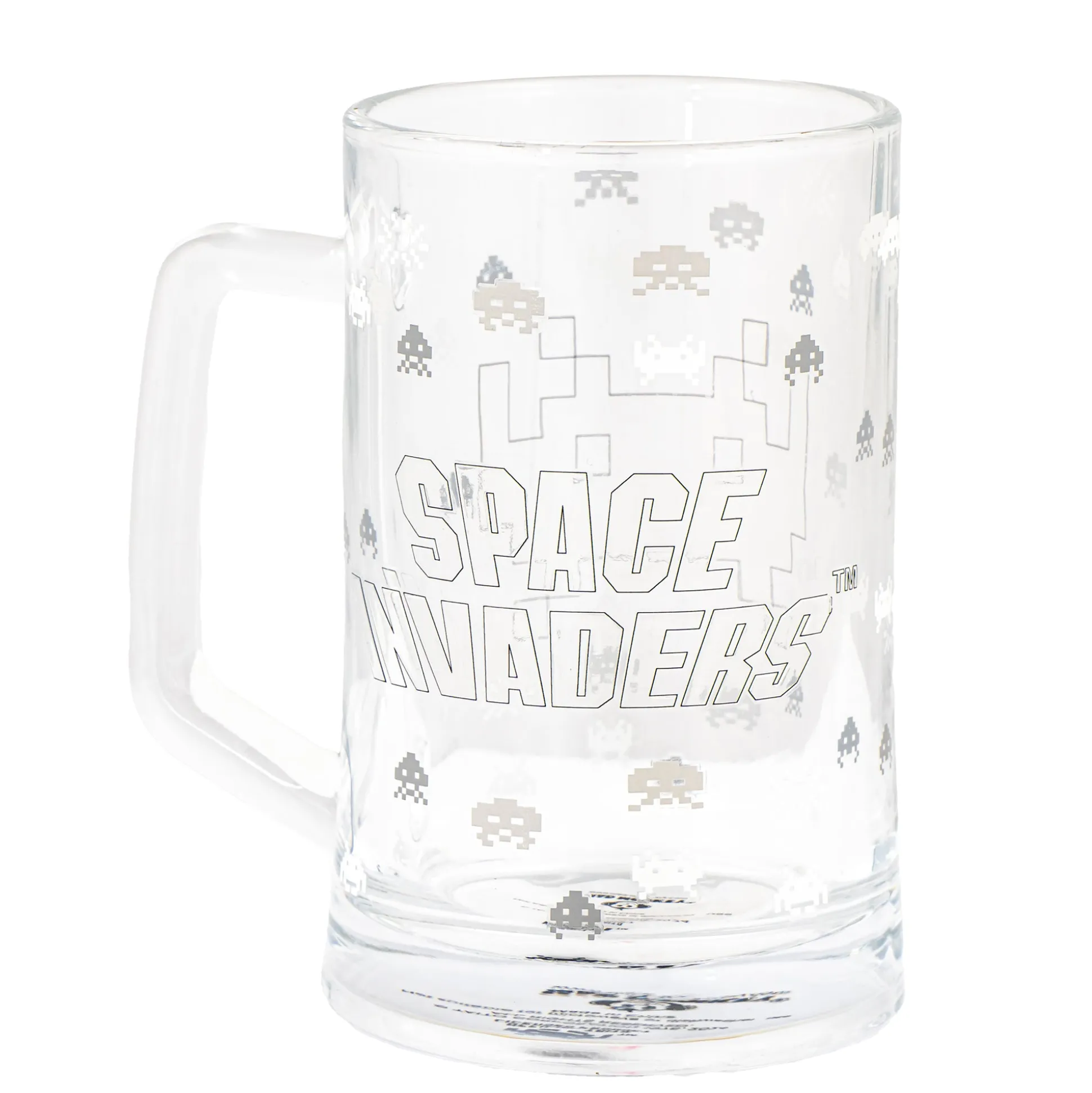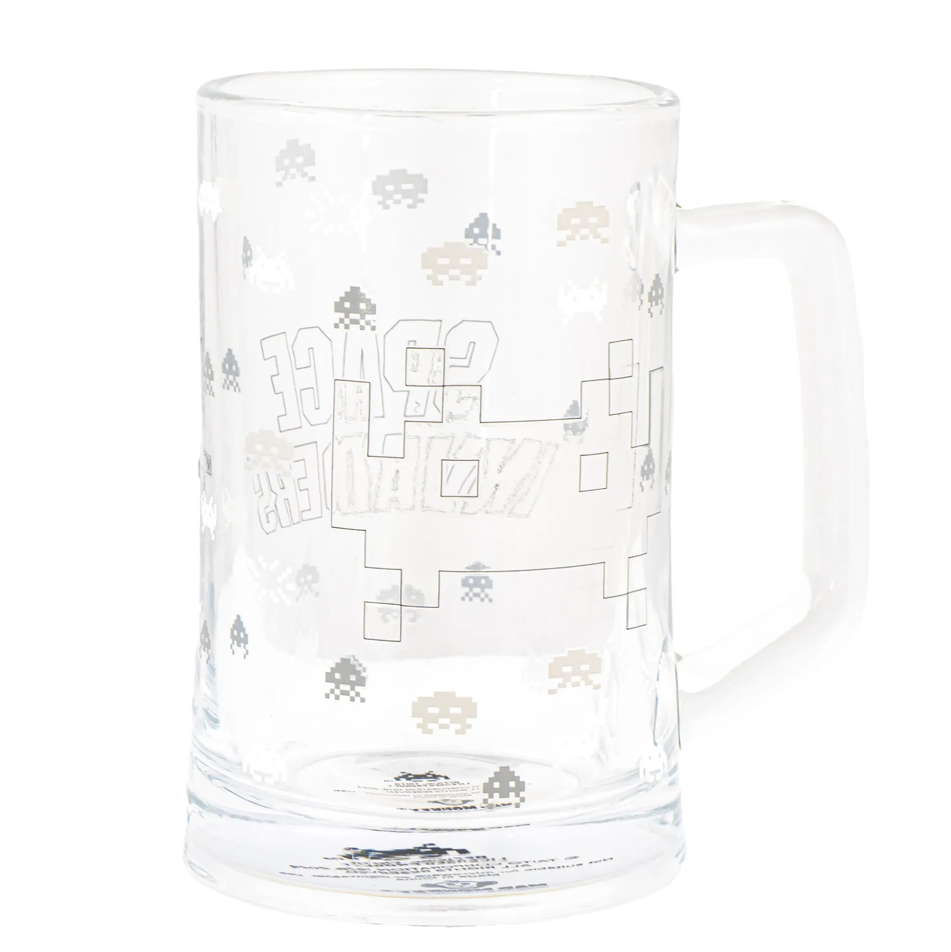 Das Bierglas besteht aus robustem Klarglas und bietet mit einem Fassungsvermögen von 350 ml genug Platz für dein Feierabendbier, eine Limo oder was auch immer dich beim nächsten Gaming-Abend begleiten soll. Die rundum gedruckten Space Invaders Motive – inklusive der klassischen Gegnerformation und dem bekannten Schriftzug – sorgen dafür, dass der nostalgische Vibe bei jedem Schluck mitkommt. Dank des stabilen Henkels liegt das Glas gut in der Hand.