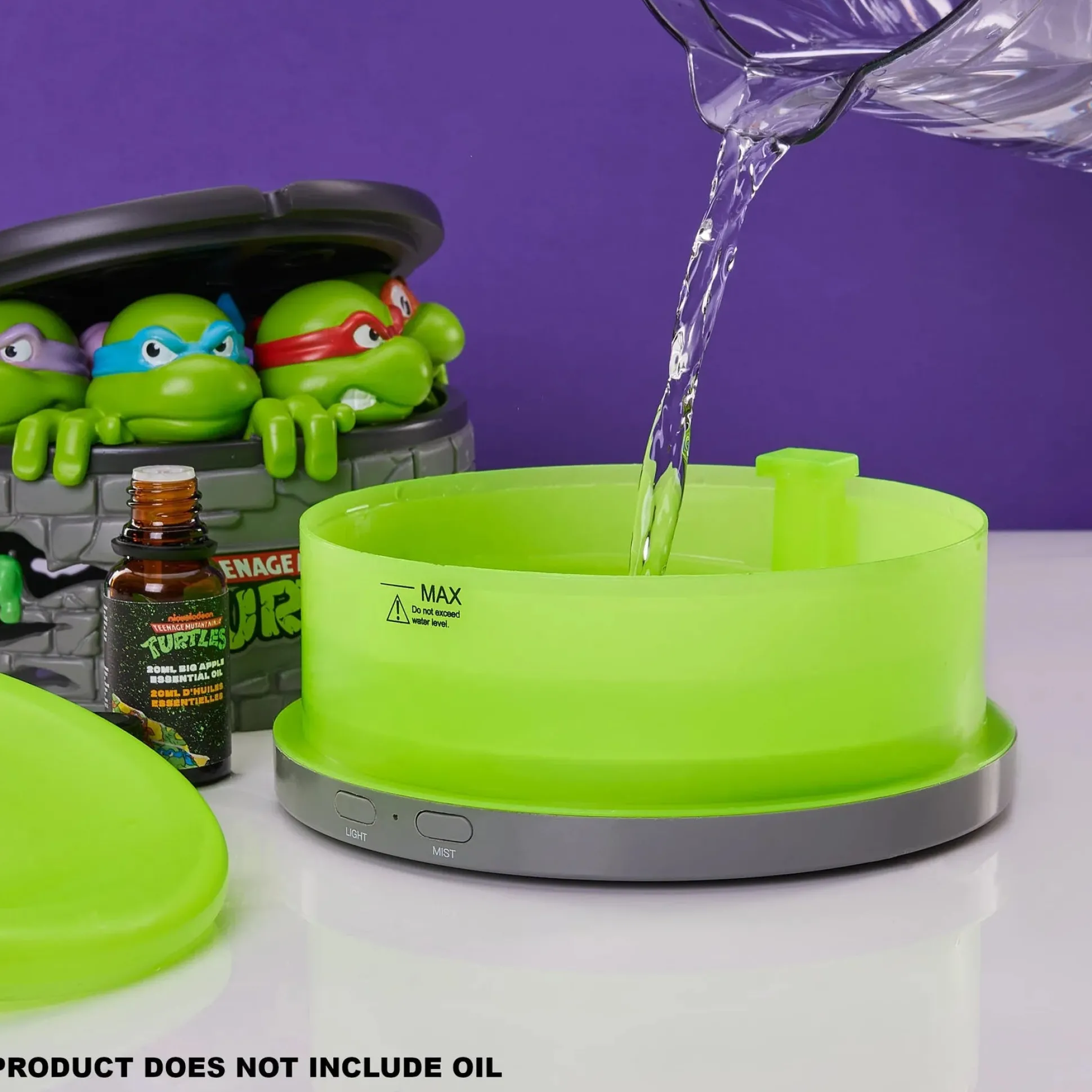 Das offiziell lizenzierte Gerät ist mehr als nur nerdige Deko: Es ist ein vollwertiger Aroma-Diffusor und Luftbefeuchter in einem – betrieben über USB und kinderleicht zu bedienen. Du bekommst sogar eine 20ml Flasche „Big Apple“- Aromaöl direkt mitgeliefert, damit du sofort loslegen kannst. Einfach Wasser einfüllen, ein paar Tropfen Öl dazu, Deckel mit Donatello, Leo, Raph und Mikey aufsetzen und mit einem Knopfdruck startet dein Entspannungsritual – natürlich mit grüner LED-Beleuchtung.