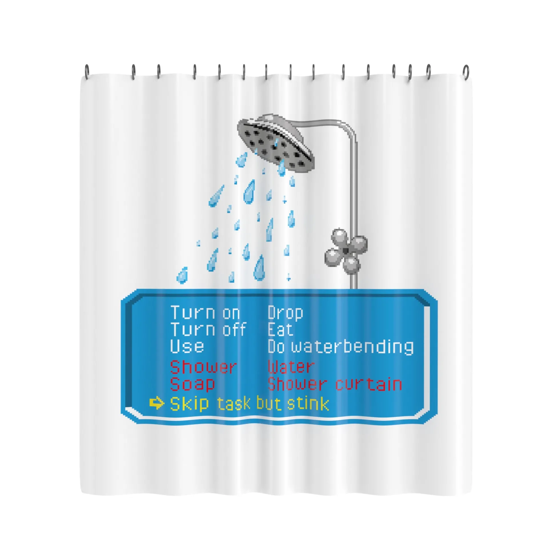 Mit diesem Adventure Game Dialogbox Duschvorhang beispielsweise wird aus der banalen Aufgabe, sich zu waschen, eine abenteuerliche Quest. Wie du es aus Videospielen deiner Kindheit kennst, kannst du zwischen verschiedenen Optionen wählen, die wiederum zu unterschiedlichen Ergebnissen führen. Bestenfalls führst du alle vorgegebenen Schritte ordnungsgemäß aus und gehst am Ende als Held oder Heldin aus dem Abenteuer hervor.