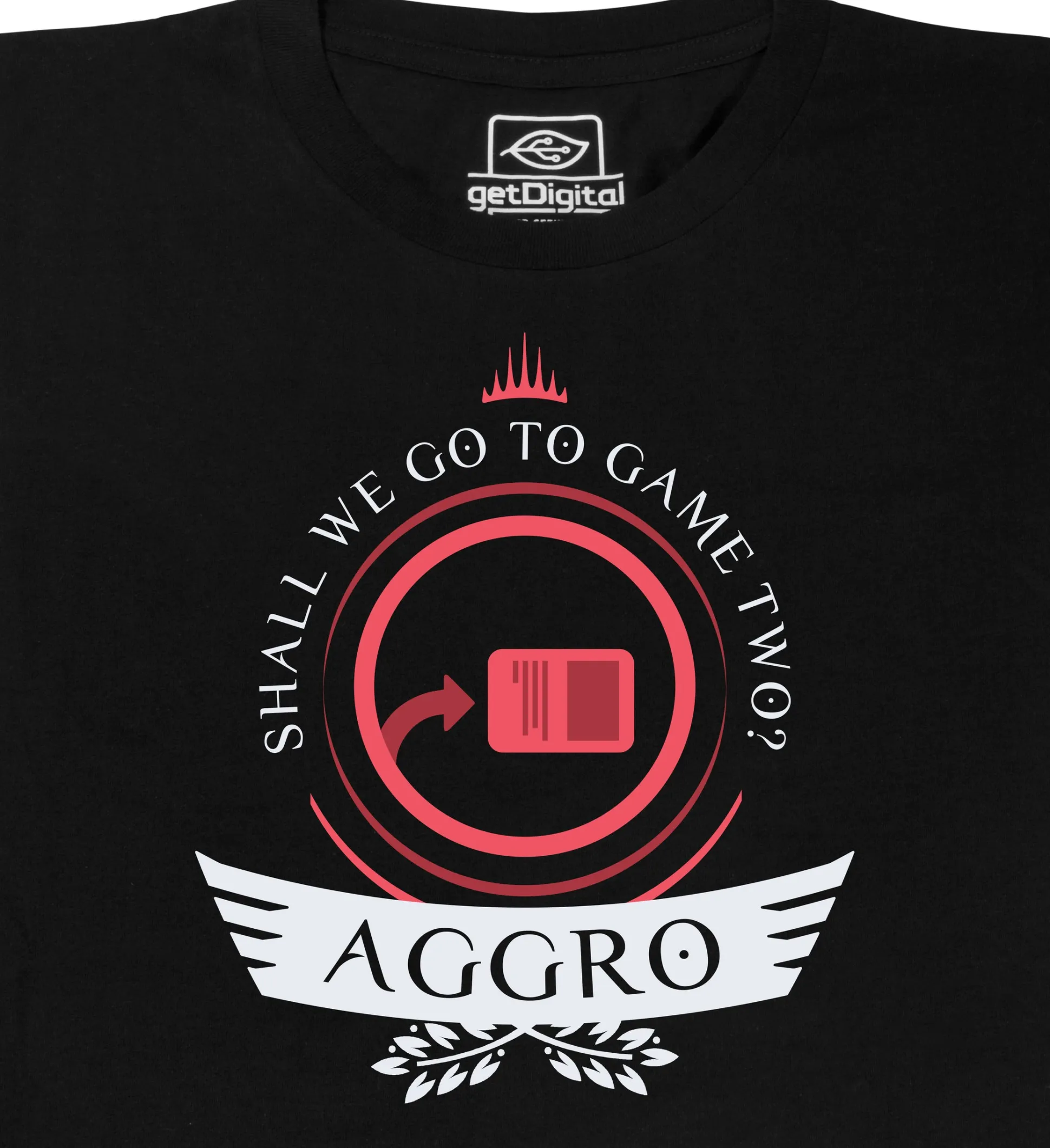 Es gibt verschieden Arten von Spielern, die man in Sammelkartenspielen wie [i]Magic[/i] antrifft: Manche Spieler setzen auf das Lategame und mächtige Kreaturen, andere darauf, die Zaubersprüche der Gegner zu kontern und wieder andere auf komplexe Combos. Und dann gibt es noch die Aggro-Spieler, denen das „Aggro Life“-Shirt aus der Seele sprechen wird.