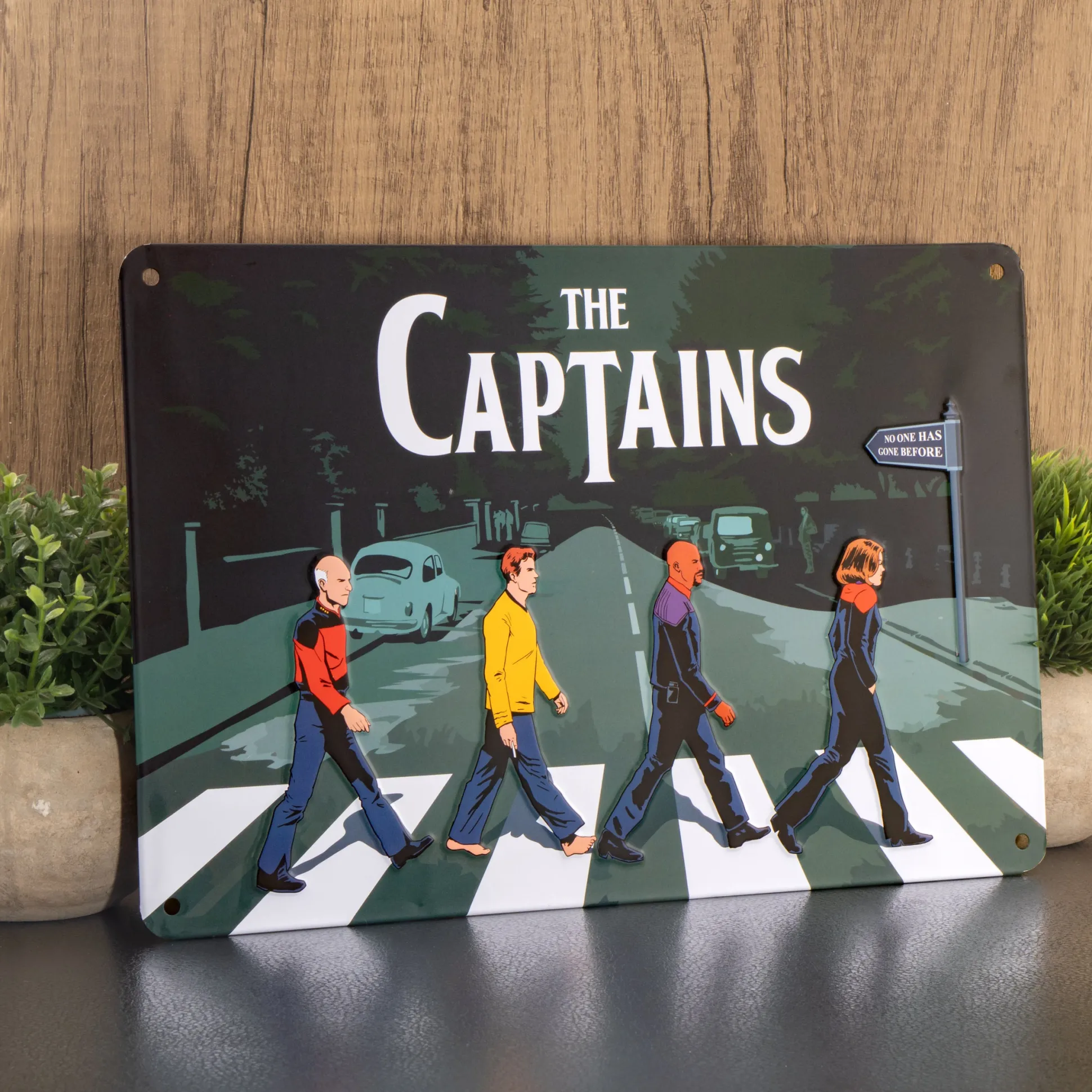 Wenn diese 4 Ikonen der Föderation zusammen über den Zebrastreifen laufen, dann kann das nur zwei Dinge bedeuten: Entweder das Raum-Zeit-Kontinuum ist kollabiert – oder du hast dir das Blechschild – The Captains an die Wand gehängt. Eine galaktische Hommage an ikonische Science-Fiction and Musikgeschichte zugleich.