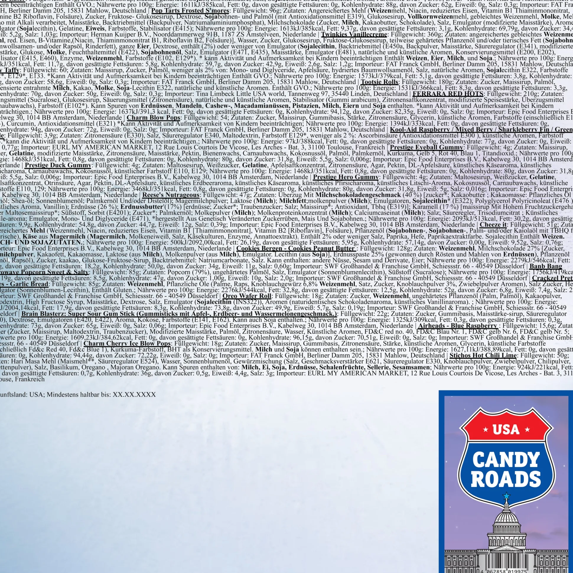 - Enthält u.a. Kaubonbons, Schokolade, Popcorn, Chips und andere amerikanische Spezialitäten