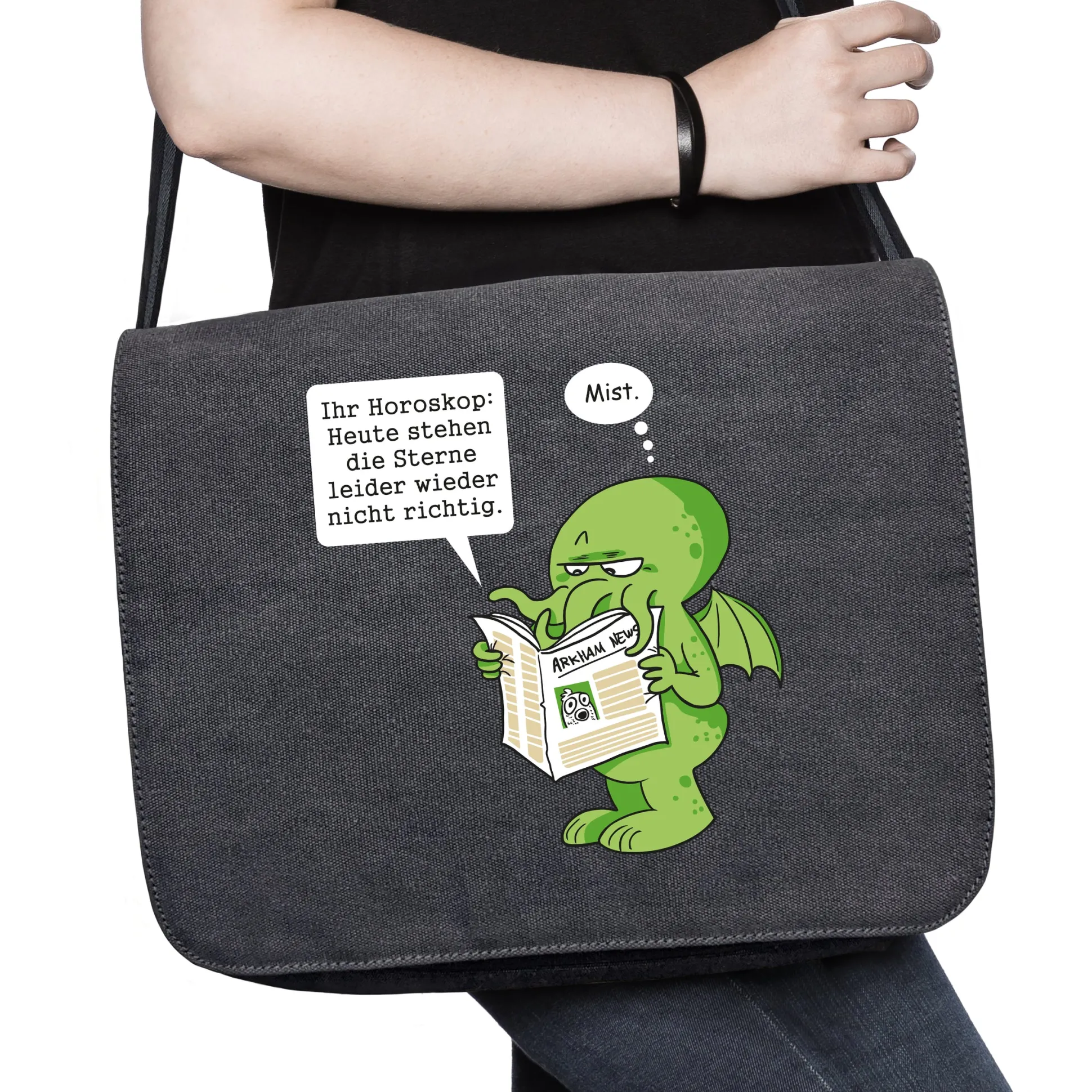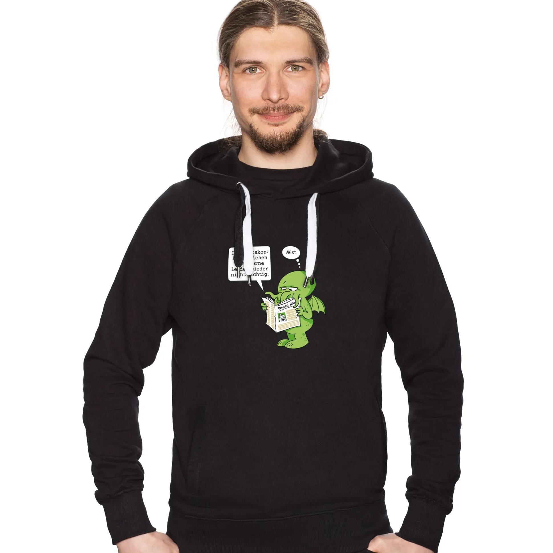 Auch wenn wir die Ankunft unseres tentakeligen Herrschers nicht sehnlicher herbeiwünschen könnten, sieht es so aus, als ob wir noch etwas warten müssen. Denn wie das „Cthulhus Horoskop“-Shirt uns zeigt, stehen die Sterne leider wieder nicht richtig. So ein Mist aber auch! Tja, dann muss unser knuddeliger Freund wohl noch etwas warten. ;(