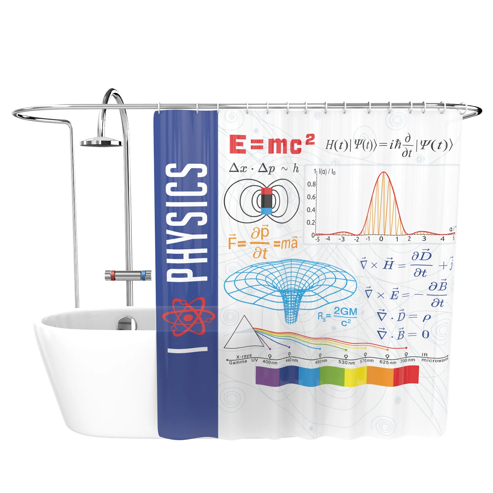 Für alle, die ganz genau wissen wollen, was alles auf dem Duschvorhang zu sehen ist:Wellenlängenskala des sichtbaren Lichts (begrenzt durch UV-Licht und Infrarot), Schematische Darstellung eines Prismas, Schrödingergleichung, Graph zum Doppelspalt-Experiment, Heisenbergsche Unschärferelation, Einsteinsche Gleichung zur Äquivalenz von Masse und Energie (E = mc²), Schematische Darstellung der Magnetfeldlinien eines Stabmagnets, Schwarzschildradius, Newtonsche Bewegungsgleichung, Maxwellgleichungen, Ergebnis eines Nebelkammerexperiments (im Hintergrund), Bohrsches Atommodell (als LOVE in „I love Physics“)