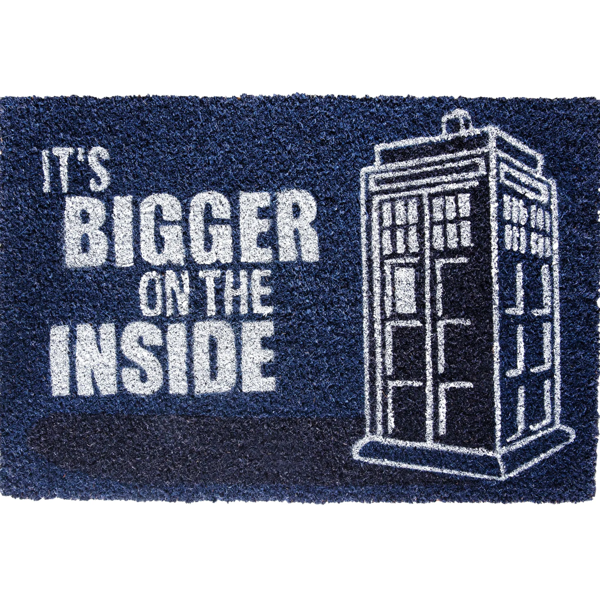 Die „It’s bigger on the inside“-Fußmatte ist die Lösung des Problems! Denn sobald Du die Polizeibox, die auf der Matte aus Kokosfasern zu sehen ist, startest, hast Du Platz ohne Ende! Warum? Wie wir aus einer extrem erfolgreichen TV-Serie wissen, ist diese Box in Wahrheit ein zeitreisendes Raumschiff, das von innen größer ist! Jetzt musst Du nur noch den leicht durchgedrehten Bewohner der Box vertreiben…