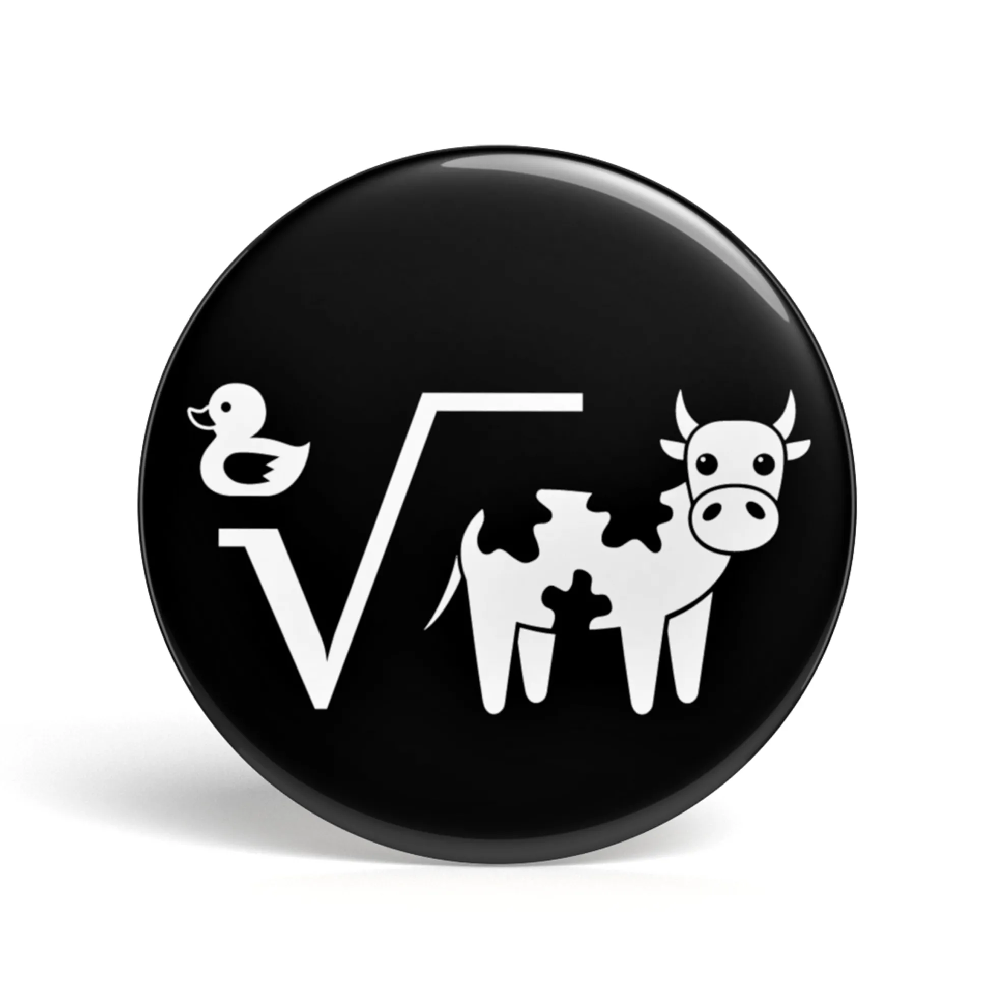Bei diesem Button geht es vor allem um die wunderbare Symbiose zwischen Mathe und dem Tierreich: Denn wie der Zufall so will, klingt „die n-te Wurzel aus Q“ genauso wie „die Ente Wurzel aus Kuh“! Ein typischer Mathe-Witz – einfach, aber effizient! 🙂