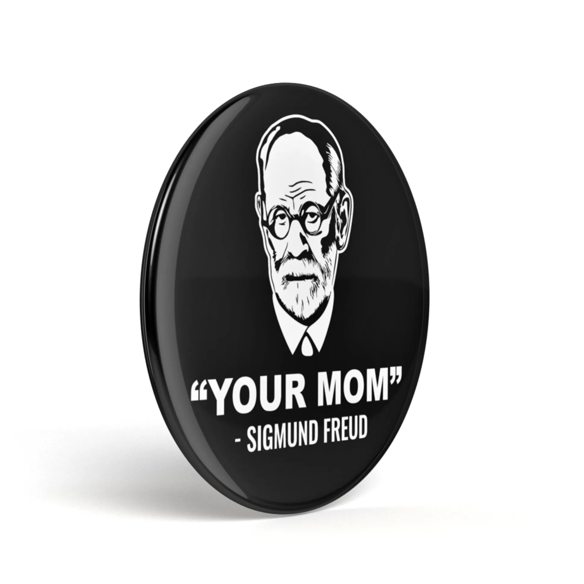 Sigmund Freud, der Vater der modernen Psycho-Analyse, hätte sicherlich seine helle Freude an den „Deine Mutter“-Witzen der letzten Jahre und diesem Button – Stichwort: Ödipus-Komplex. 😉