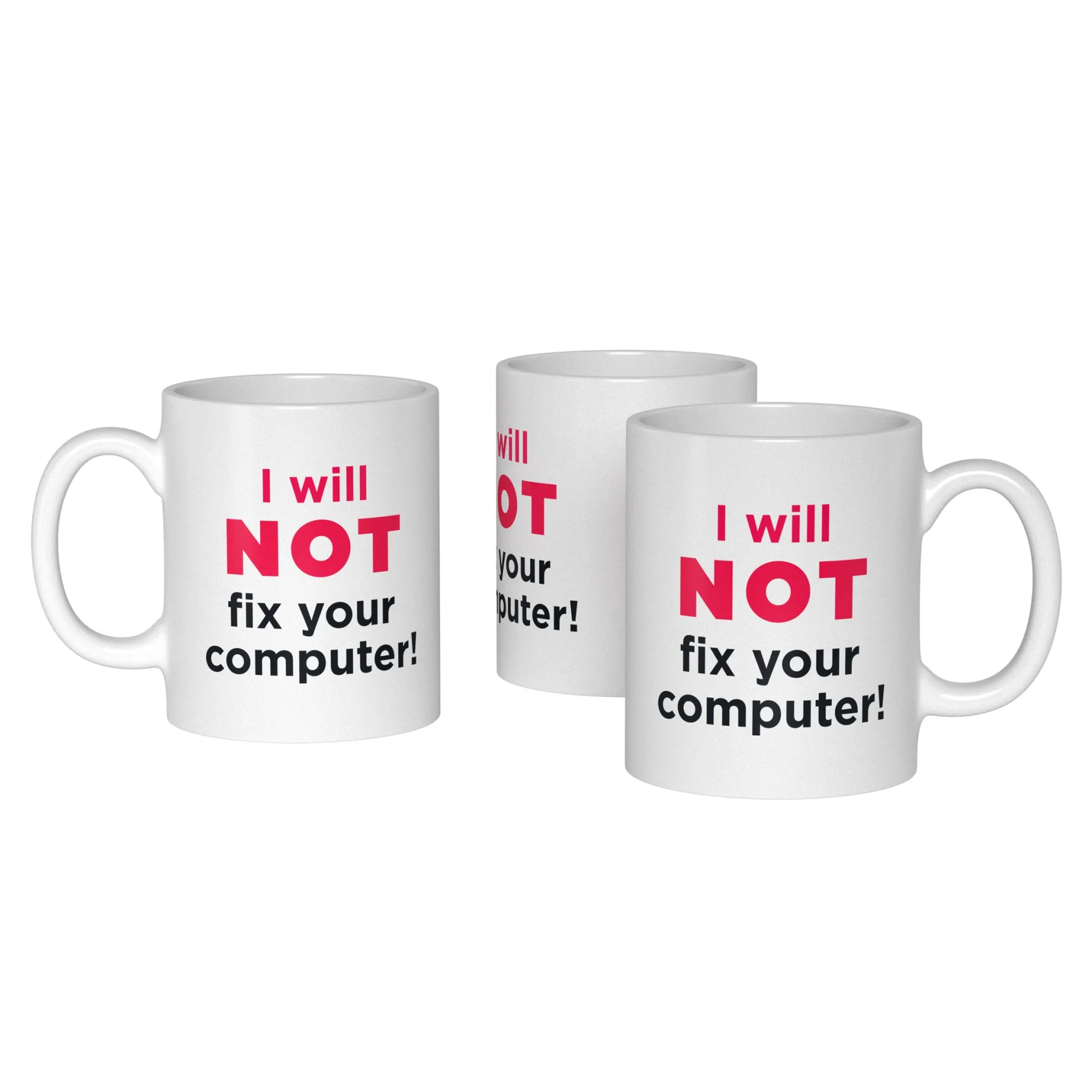 Damit Du nicht von allen Menschen als kostenloser Servicetechniker gesehen wirst, der in seiner Freizeit nichts lieber tut als anderer Leute Computer aus- und wieder anzuschalten, solltest Du fortan niemals ohne den „I will not fix your computer“-Becher das Haus verlassen. Neben der Möglichkeit, ein leckeres Getränk mit Dir herumzutragen, kannst Du den Becher auch einfach mit einem müden Lächeln heben, wenn Dir die nächste Person hilfesuchend mit ihrem Router in der Hand entgegenwankt. Denn sobald man einmal jemandem bei solchen Problemen hilft, ist man auf ewig für diesen Job auserkoren. Und das kann selbst den nettesten Informatiker zum Tier werden lassen…