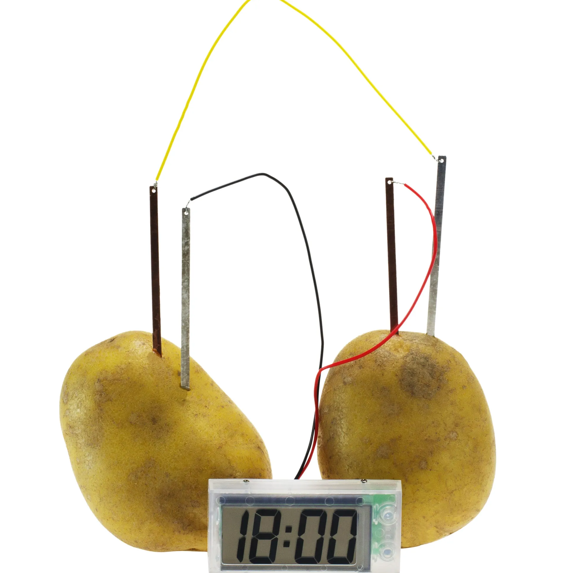 Vielleicht erinnerst Du Dich noch an Deinen ersten Physik-Baukasten, mit dem man aus verschiedenen Früchten Strom für eine kleine Glühbirne gewinnen konnte? Genauso funktioniert die Kartoffel Uhr, nur dass man statt einer schwachen Lampe eine funktionierende Digitaluhr betreiben kann. Die Kartoffel-Batterie