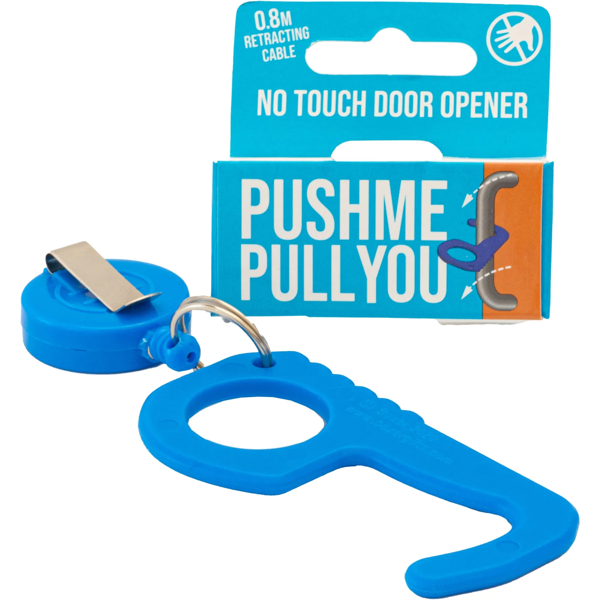 Damit du diese nicht mehr anfassen musst und somit deinen Händen das austrocknende Desinfektionsmittel ersparen kannst, gibt es den praktischen kontaktlosen Türöffner. An Gürtel oder Hose befestigt hast du so immer einen Haken dabei, den du im Griff oder in der Klinke einhaken kannst, um die Tür zu öffnen. Die 80 cm lange, ausziehbare Leine daran bietet dir dabei maximale Bewegungsfreiheit.