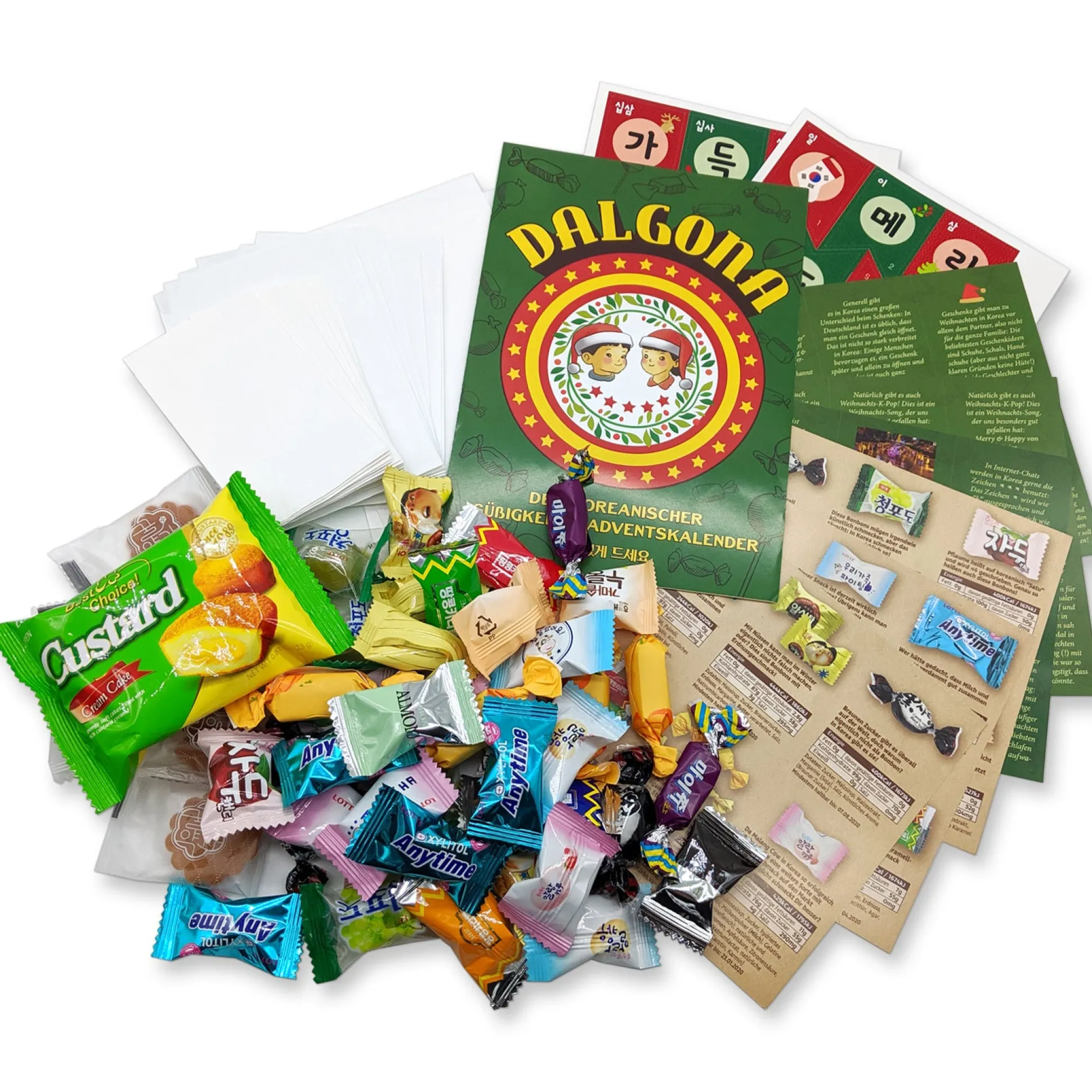 Mit dem Dalgona-Süßigkeiten-Adventskalender bringen wir jede Menge leckere Süßigkeiten direkt aus Korea zu Dir nach Hause: Dich erwarten 24 Tüten, die Du mit insgesamt 42 ausgewählten koreanischen Köstlichkeiten füllen kannst, um anschließend einer anderen Person ein Freude zu machen.