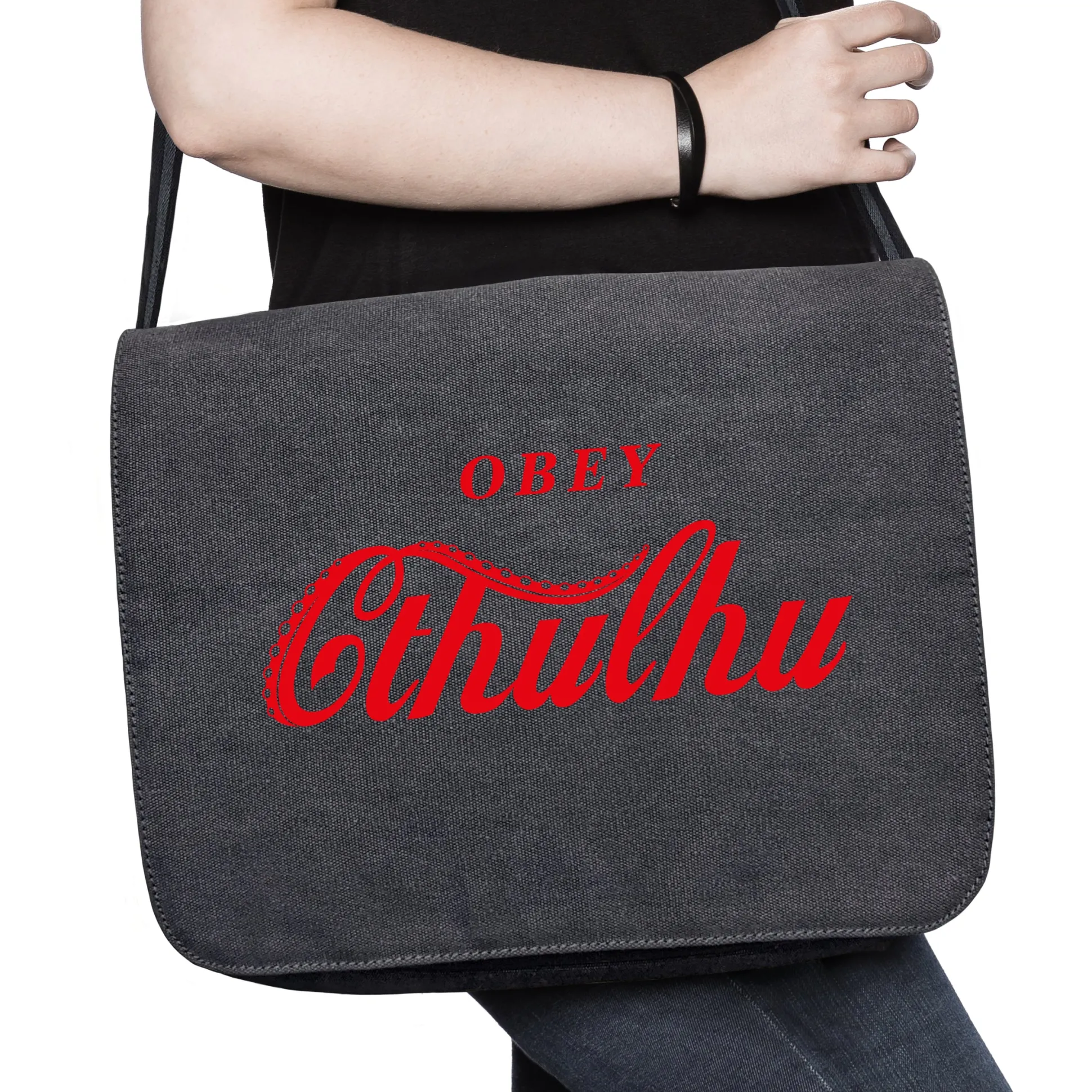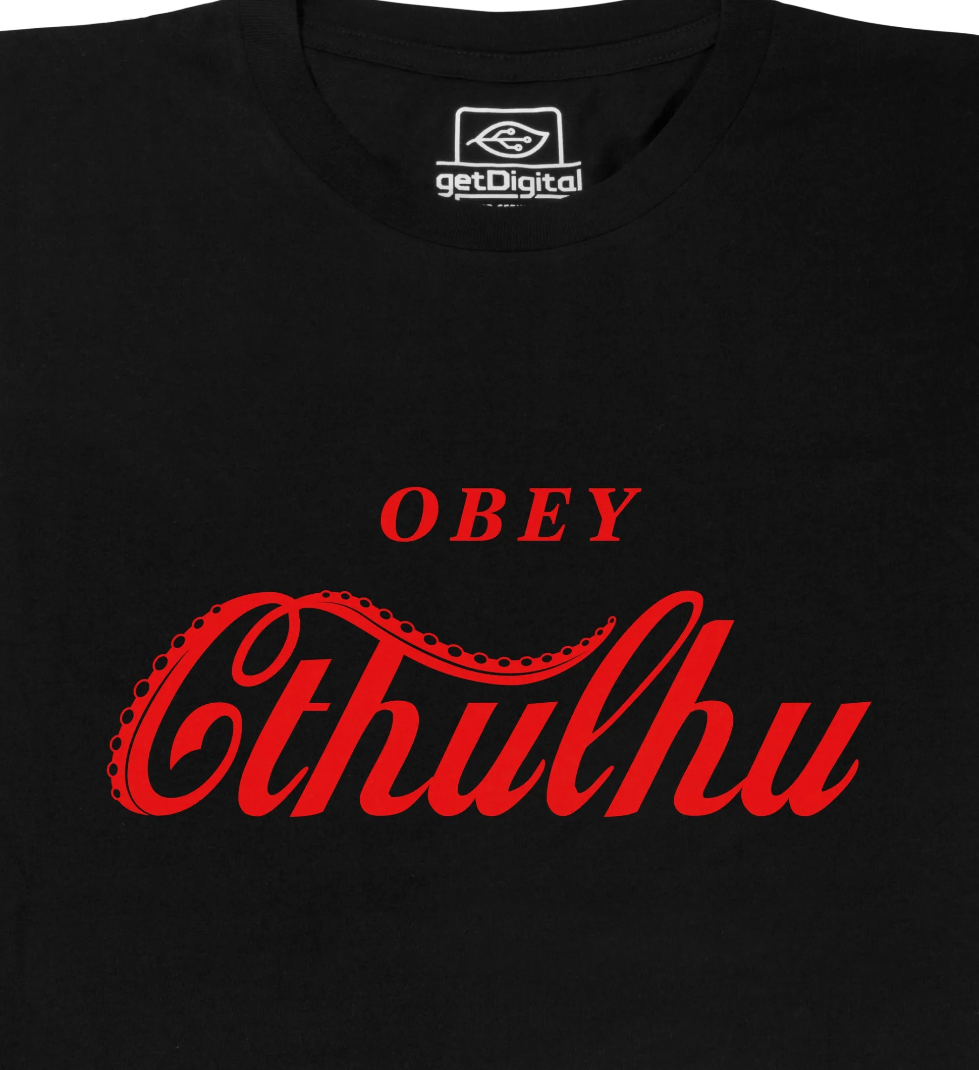 Warum? Schau Dir mal ganz genau das „Obey Cthulhu“-T-Shirt an: Auf den ersten Blick wirst Du nur die Werbung eines bekannten Cola-Herstellers sehen. Bei genauerem Hinsehen wirst Du allerdings bemerken, dass dort nicht etwa „Enjoy **** Cola“ (engl.: [i]Genieße **** Cola[/i]) steht, sondern „Obey Cthulhu“ (engl.: [i]Gehorche Cthulhu[/i])! Wer sich mit Okkultismus auskennt, weiß natürlich, wer Cthulhu ist: Der bekannteste der Großen Alten aus den Werken H. P. Lovecrafts. Und dieser riesige Tintenfisch hat kein anderes Ziel, als die Menschheit zu vernichten! Neuerdings scheint er statt auf Kultisten wohl eher auf stark gezuckerte Softdrinks zu setzen… 😉