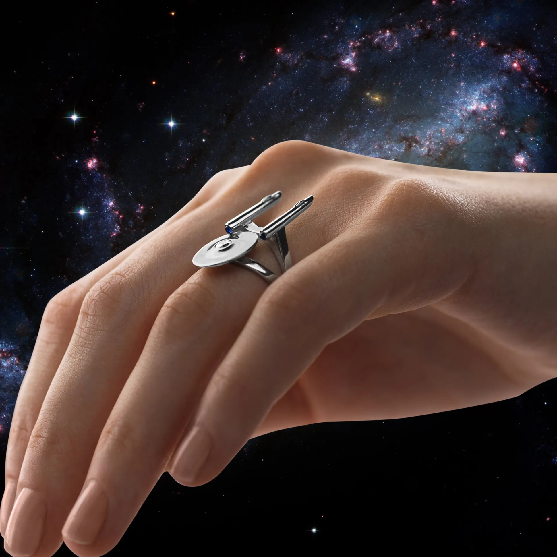 In Romanen, Filmen und Serien gibt es zwar unzählige Konzepte für Raumgleiter, Space-Shuttles und sogar interstellare Schlachtschiffe, die Realität sieht jedoch deutlich ernüchternder aus. Bis Du also eine Nachbildung eines echten Raumschiffes in den Händen halten kannst, werden wohl noch einige Jahre vergehen. In der Zwischenzeit gibt es für Dich zum Glück die Möglichkeit, Deine Liebe zu Science-Fiction, Raumfahrt und vielleicht auch einer anderen Person mit einem schmucken Raumschiffring auszudrücken.