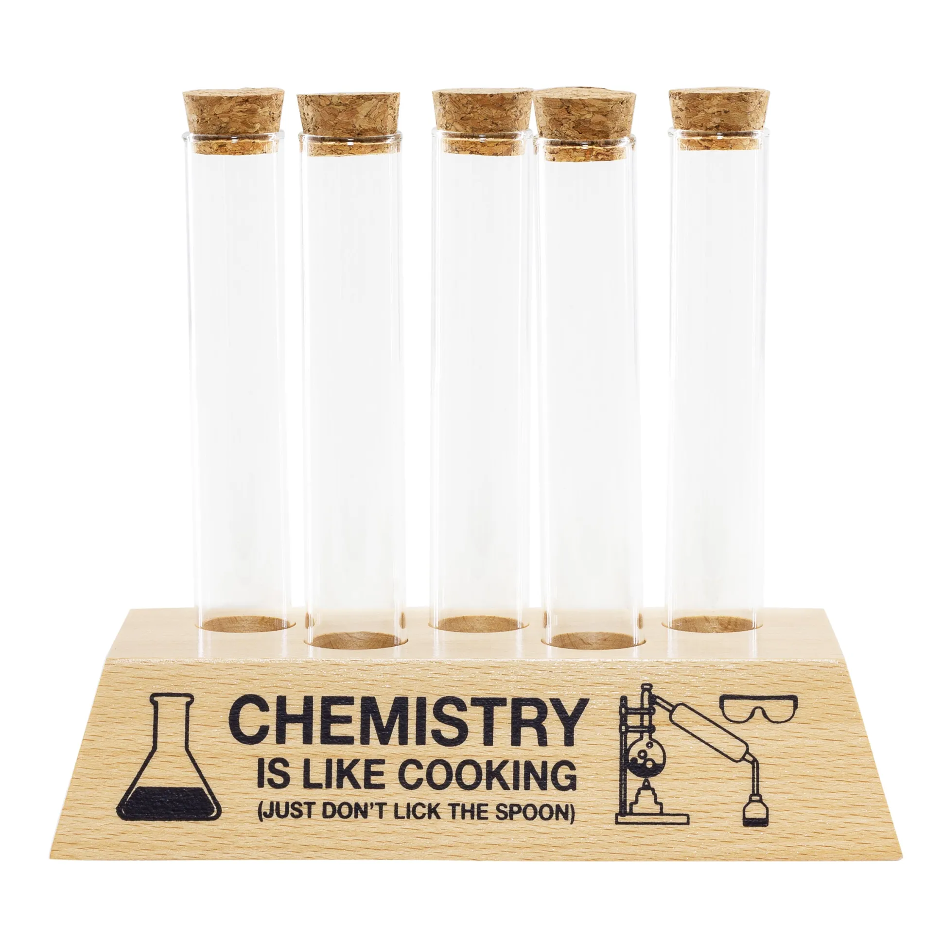 Und das Reagenzglas-Gewürzregal wird Dir dabei helfen, auch in diesem Feld zur absoluten Elite zu gehören! Auf dem Sockel aus massivem Buchenholz finden fünf Glasröhrchen Platz, die sich mit Gewürzen füllen und mit einem Korken verschließen lassen. Dank der Lackierung verkraftet das Holz auch den gelegentlichen Spritzer Tomatensauce ohne Probleme! Und falls Du im Eifer des Gefechts doch mal durcheinander kommst und nicht weißt, ob Du gerade im Labor oder in der Küche bist, hilft Dir der Aufdruck weiter: Chemie ist wie Kochen, nur solltest Du bei ersterem den Löffel nicht ablecken. Und überhaupt: Natriumchlorid, Natriumphosphat – wo ist da denn bitte der Unterschied? 😉