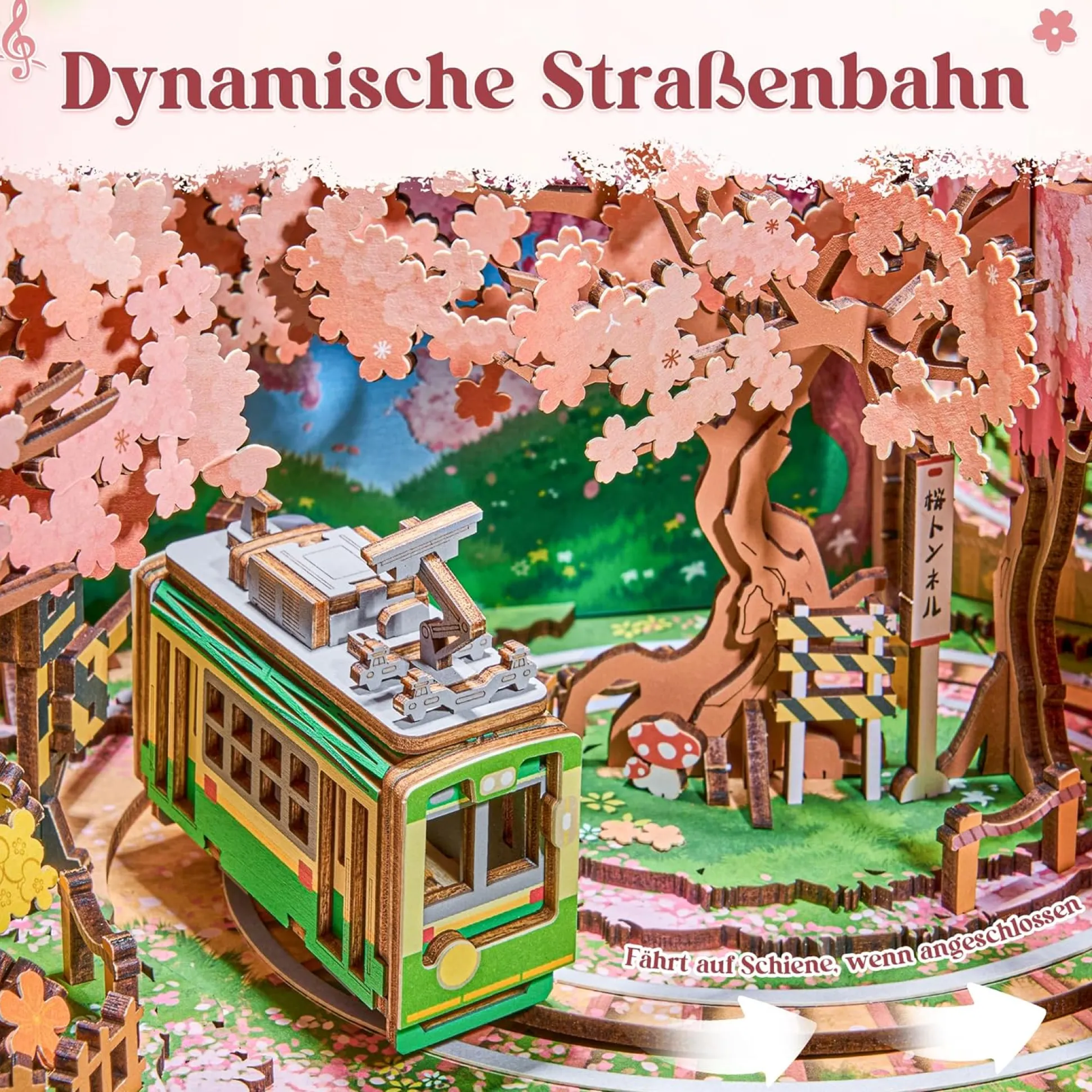 Tauche ein in eine zauberhafte Miniaturwelt der Kirschblütenzeit! Der Sakura Traumtour Retro TV Spieluhr Holzbausatz bringt nostalgischen Charme und moderne Technik in einem liebevoll gestalteten DIY-Projekt zusammen. Inspiriert vom Retro-Fernseher-Design entfaltet sich im Inneren eine dynamische Szenerie mit einer fahrenden Straßenbahn unter blühenden Kirschbäumen – begleitet von Musik, Licht und Bewegung.