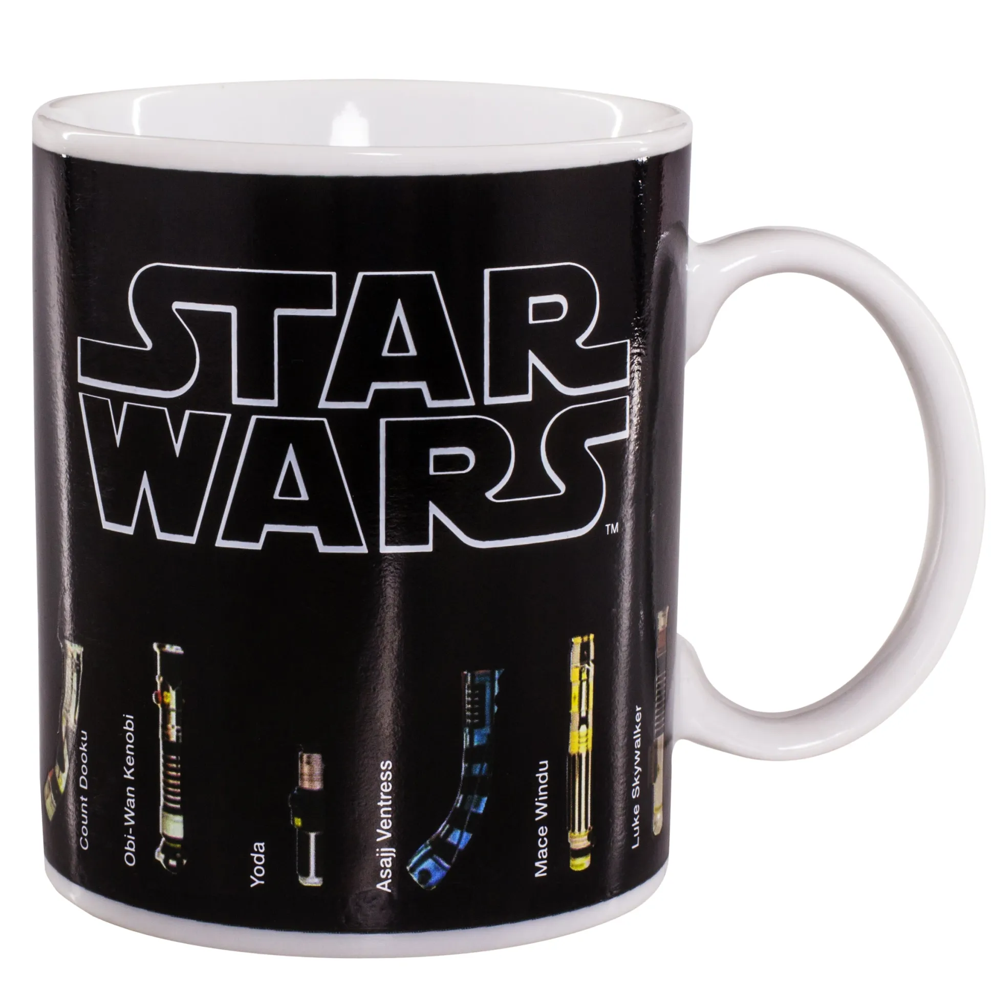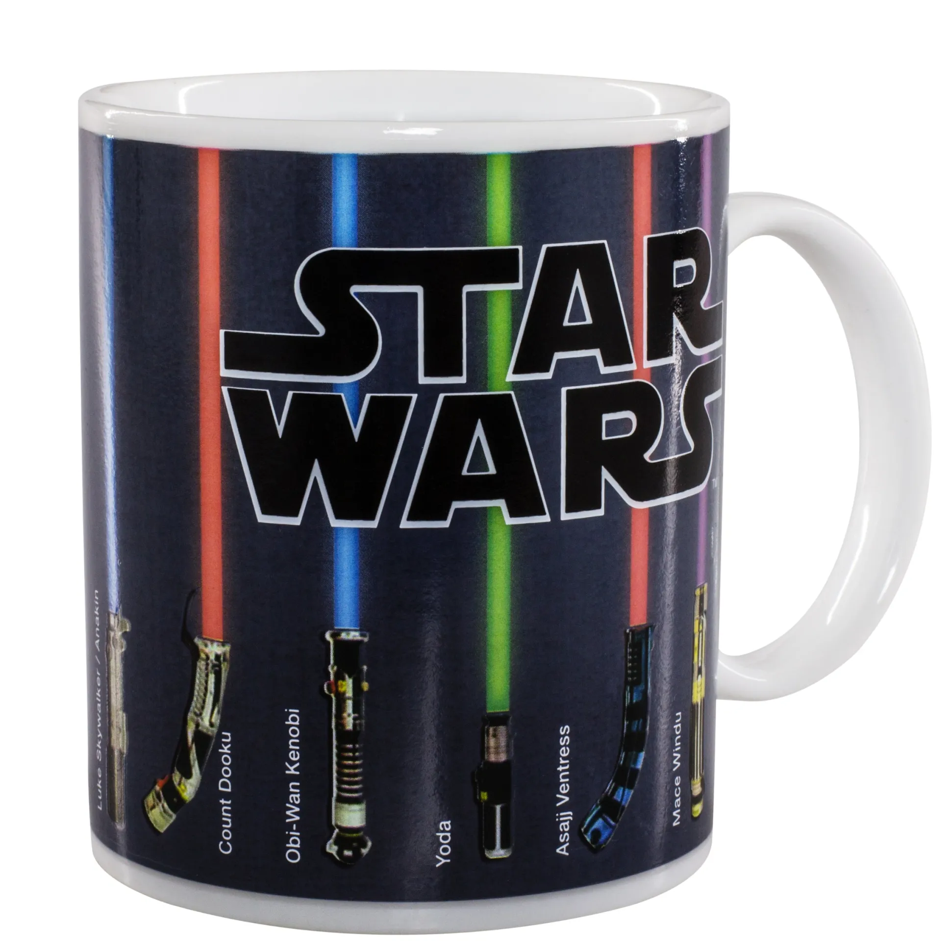 Zunächst zeigt der Becher allerdings nur die Griffe der Lichtschwerter, natürlich mit allen nötigen Details. Füllst Du etwas heiße Energie ein und fügst etwas Macht hinzu, also ein heißes Getränk wahlweise mit Zucker oder Milch, erscheinen die verschiedenen Klingen. Insgesamt 13 Lichtschwerter sind auf dem Becher unterhalb des Star Wars-Logos abgebildet; das Logo überschneidet die Klingen. Du willst es ganz genau wissen? Die Waffen dieser Figuren sind zu sehen: Qui-Gon Jinn, Kit Fisto, Darth Vader, Anakin/Luke Skywalker, Obi-Wan Kenobi, Darth Maul, Count Dooku, Yoda, Asajj Ventress, Mace Windu. Jedes Lichtschwert ist neben der Farbe am charakteristischen Griff zu erkennen. Damit Du nicht durcheinander kommst, stehen die Namen aber auch noch einmal daneben. 😉