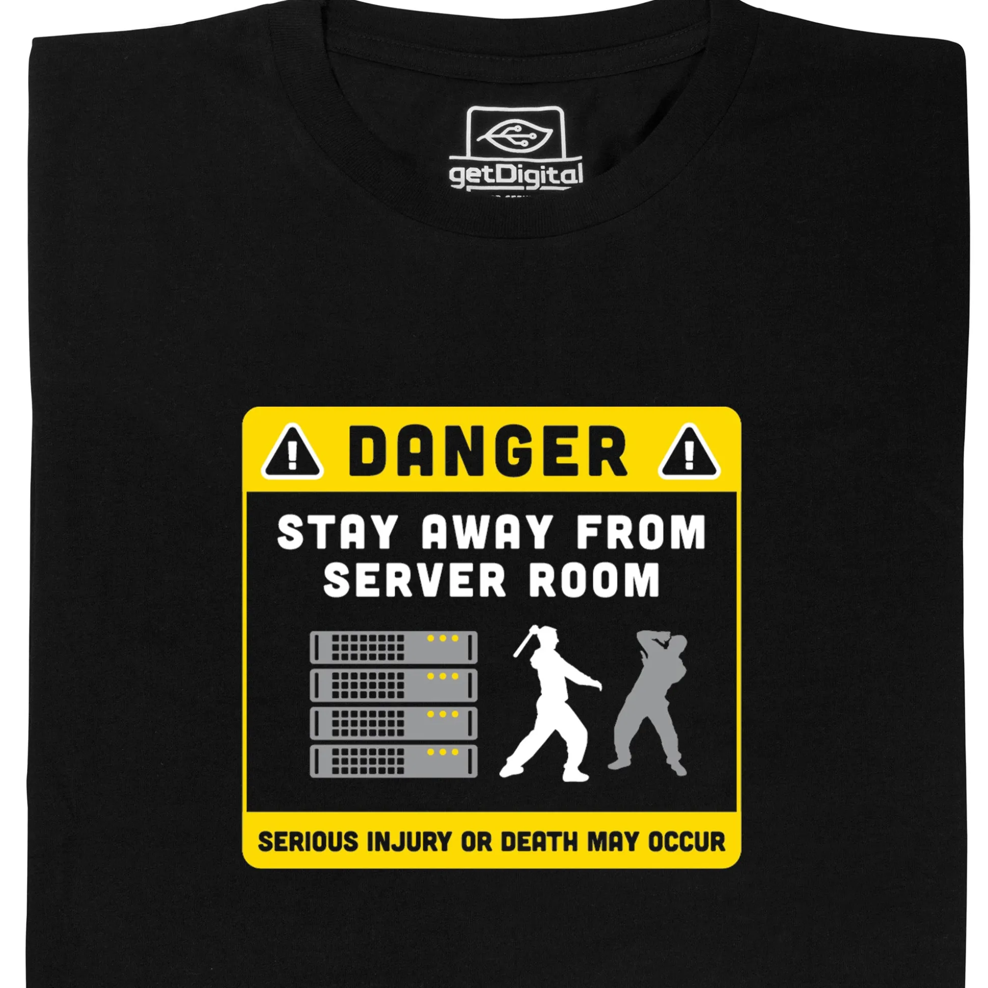 Und vielleicht ist er bewaffnet. Unterschätze nie einen Nerd. Vor allem nicht einen, der dieses “Stay away from Server” T-Shirt trägt!