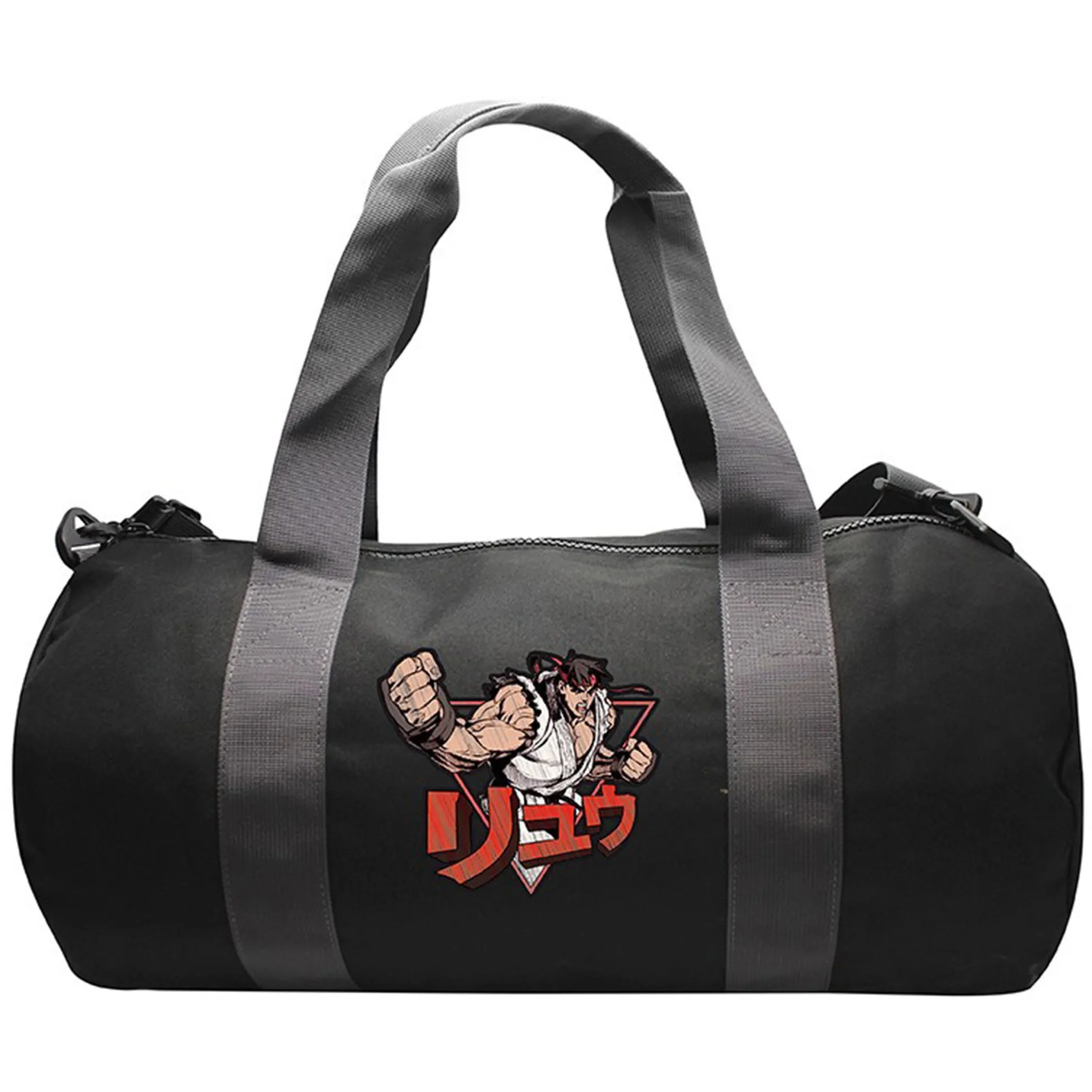 - Schwarze Sporttasche, auf der ein Bild des Charakters Ryu aus der Videospielserie Street Fighter abgebildet ist