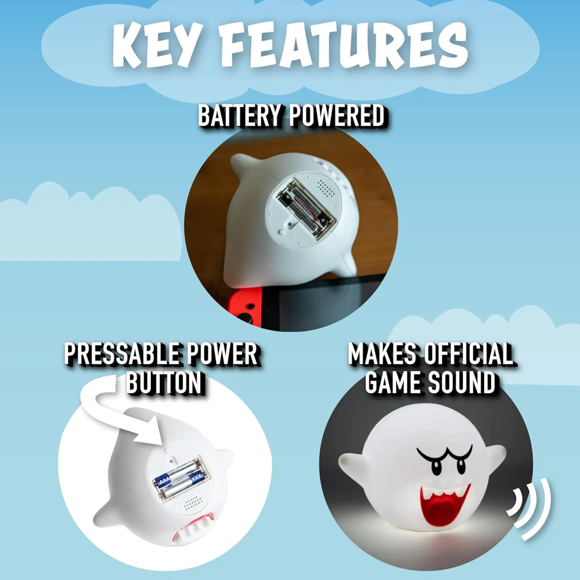 Mit einer Höhe von 12 cm und betrieben durch zwei AAA-Batterien (nicht enthalten), ist Boo vollkommen mobil und überall einsatzbereit. Der kleine Geist leuchtet nicht nur stimmungsvoll, sondern spielt beim Einschalten auch den originalen Boo-Soundeffekt aus den Super Mario-Spielen. Ein liebevolles Detail, das Fans sofort ein nostalgisches Grinsen entlocken wird. Ob als Nachtlicht, Deko oder sammelwürdiges Stück Videospielgeschichte.
