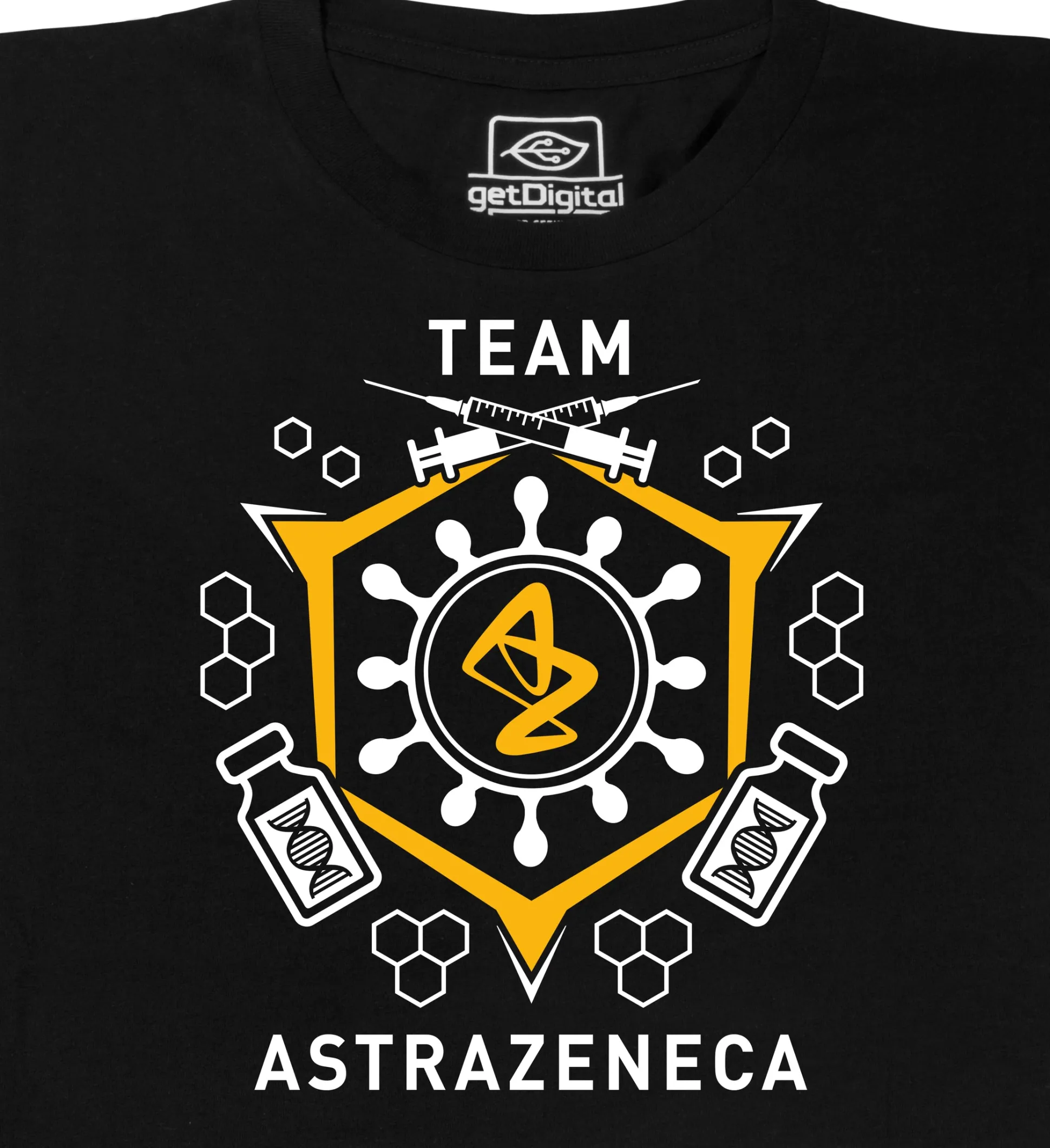 Der Impfstoff von AstraZeneca war der erste, der schon früh in großen Mengen verfügbar war. Dieser klassische Vektorimpfstoff ist außerdem der einzige, der schwere Verläufe zu 100% verhindern kann! Auf dem Team AstraZeneca-T-Shirt findest du ein farblich passendes Logo, das an das Firmenlogo von AstraZeneca angelehnt ist, umgeben von zwei kleinen Behältern, in denen die für den Vektorimpfstoff nötige Viren-DNA steckt. Außerdem zwei Spritzen, die auf die zwei Impfdosen anspielen. Und die kleinen, dekorativen Corona-Viren ringsumher können dir nun nichts mehr anhaben! 😉