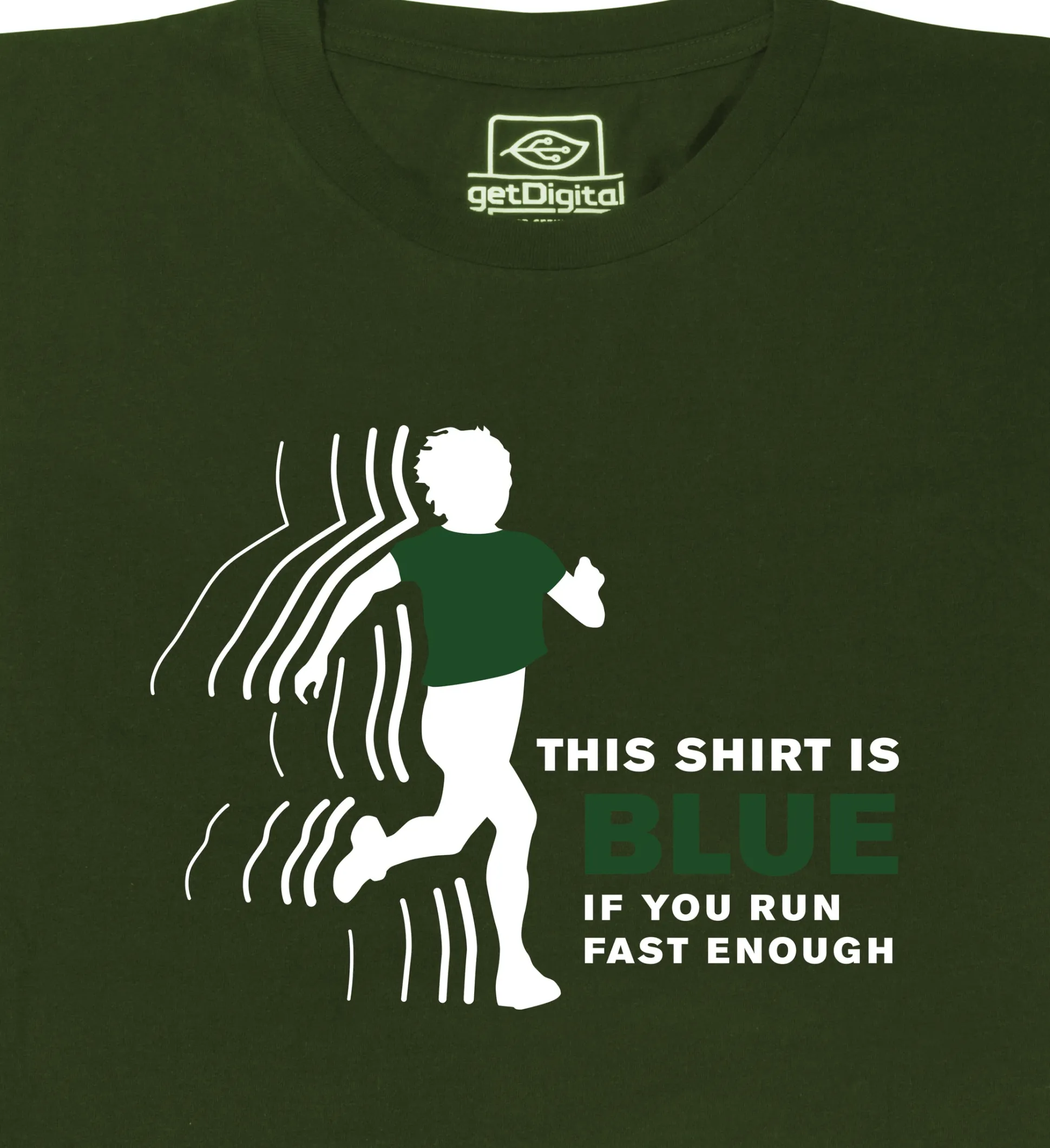 Wenn Du Dich etwas anstrengst und wirklich [i]schnell[/i] läufst, könnte dieses grüne T-Shirt blau erscheinen. Und mit schnell meinen wir so richtig rasant. 😉