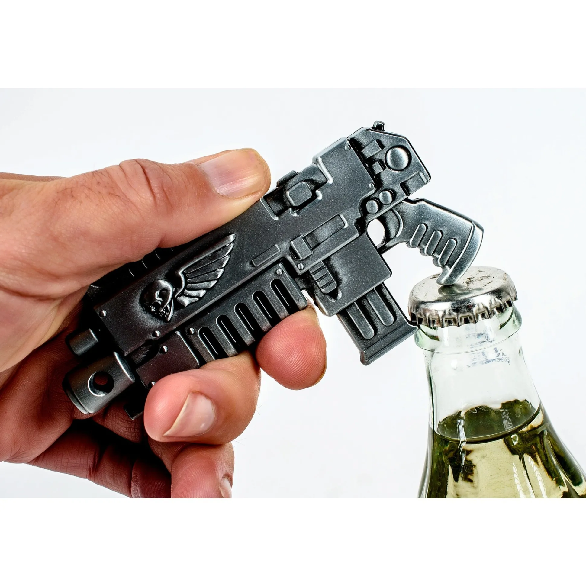 Wenn es der Wille des Imperators ist, dass eine Flasche geöffnet wird, soll sich kein Kronkorken seinem Willen widersetzen. Falls doch, sind diese Flaschenöffner bestens geeignet, die ketzerischen Verräter mit Gewalt zu vertreiben und die Flasche zu zwingen, ihren kostbaren Inhalt dem Imperium zu übergeben. Zu diesem Zweck stehen verschiedene Varianten zur Auswahl: Das Boltergewehr, das Chaos-Kettenschwert und das Adeptus Astartes-Kettenschwert.