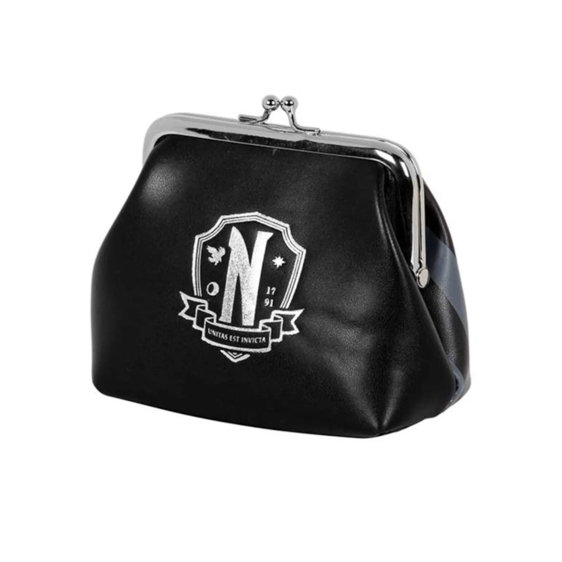 - Tiefschwarze Geldbörse mit dem Logo der Nevermore Academy aus der Serie “Wednesday”